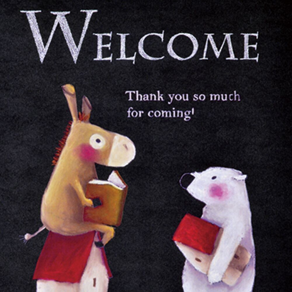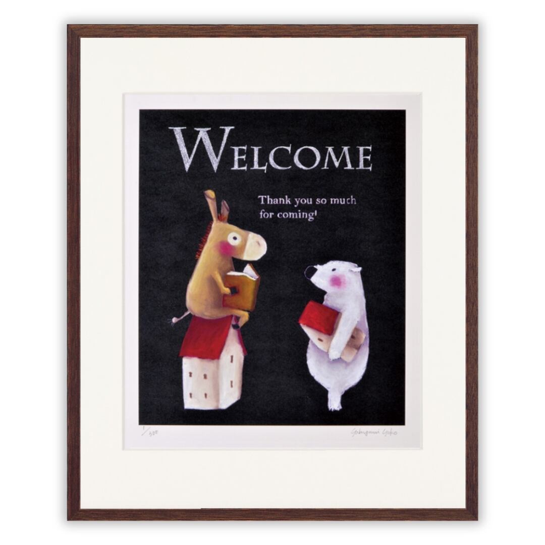 やわらかなタッチで描かれたロバとシロクマが、本を抱えながら向かい合う姿が印象的なイラストです。背景の深いブラックがキャラクターの愛らしさを際立たせ、まるで絵本のワンシーンのような温もりを感じさせます。「WELCOME」という大きな文字と「Thank you so much for coming!」というメッセージが添えられ、見る人の心をほっと包み込む構図。動物たちの丸みのあるフォルムと、優しい色づかいが穏やかな空気感を生み出しています。日常の中に小さな癒しと優しさを届けてくれる、心温まるアート作品です。