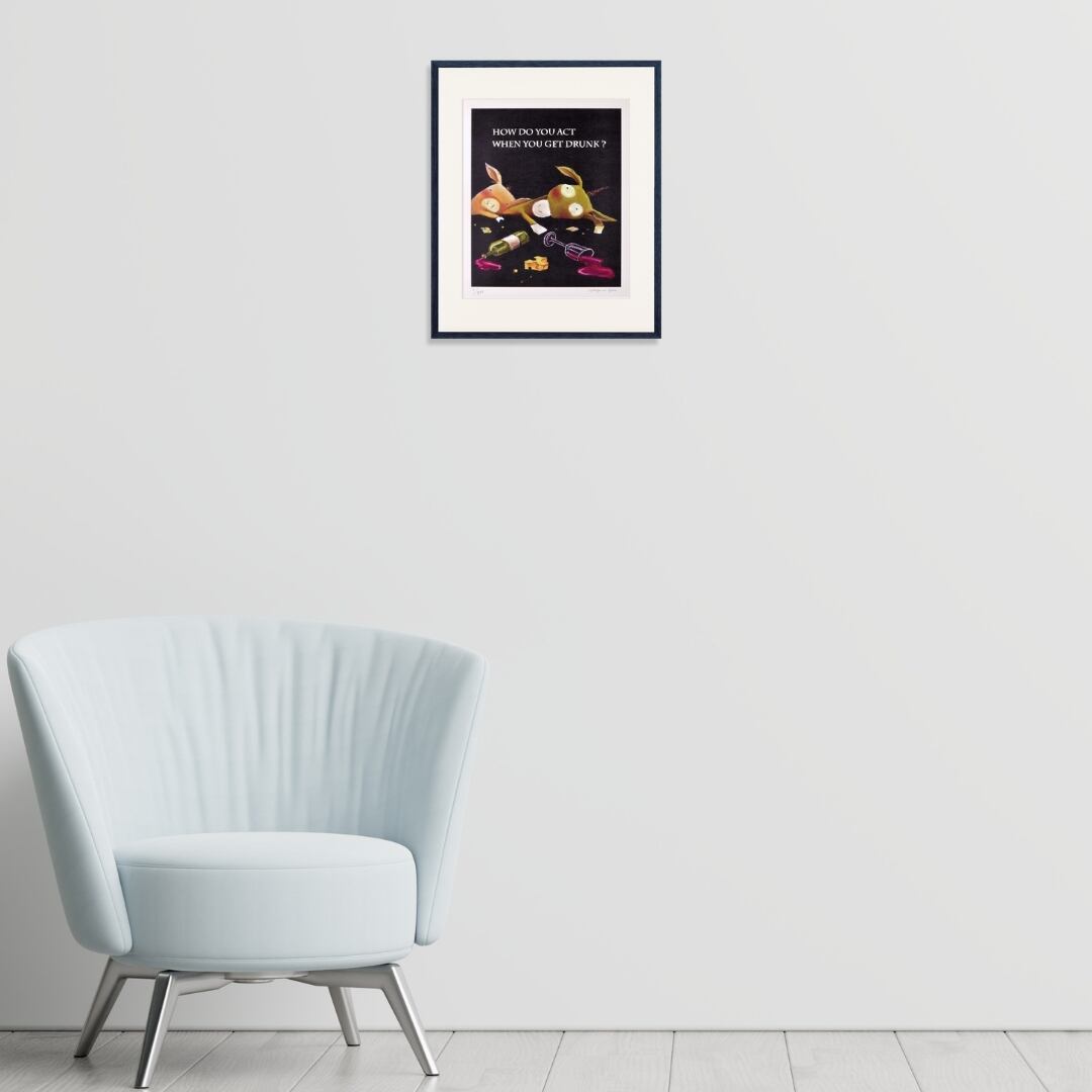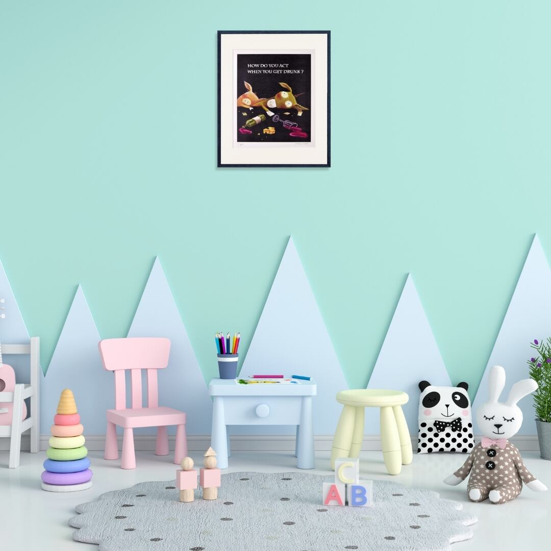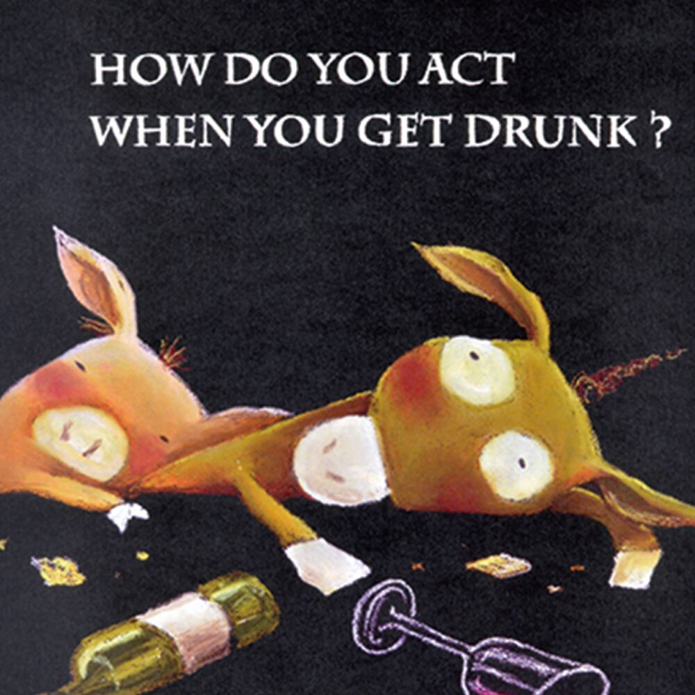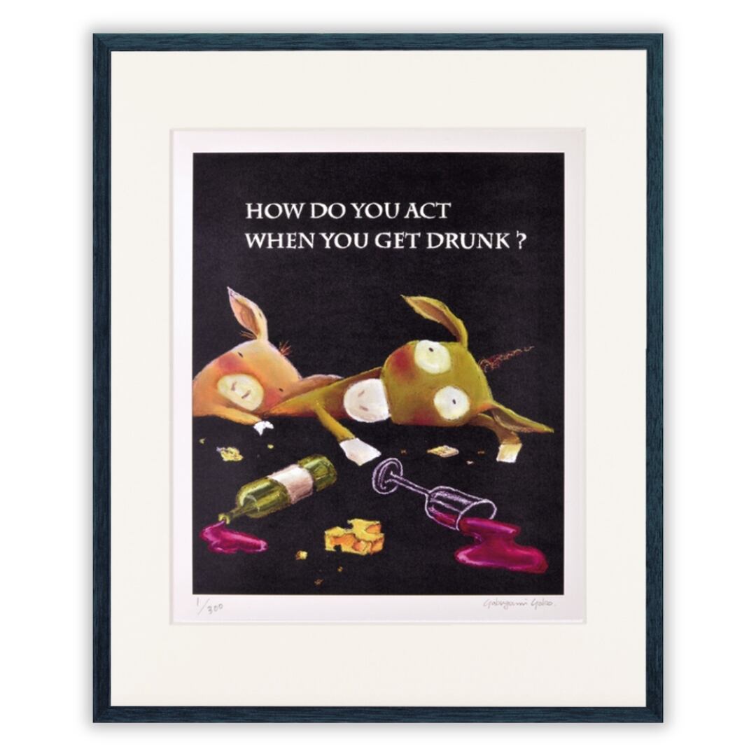 大胆な色使いとユーモラスな構図が印象的なイラストです。ワインボトルやチーズが散らばる中、酔いつぶれたロバとブタが寝転ぶ様子がコミカルに描かれています。表情や姿勢のひとつひとつに、楽しげな夜の余韻と少しの脱力感が感じられ、見ているだけで笑みがこぼれる作品です。黒を基調とした背景が鮮やかなキャラクターを際立たせ、洗練された大人の遊び心を演出。イラストとしての完成度が高く、ユーモアと個性を楽しみたい方にぴったりのアートです。