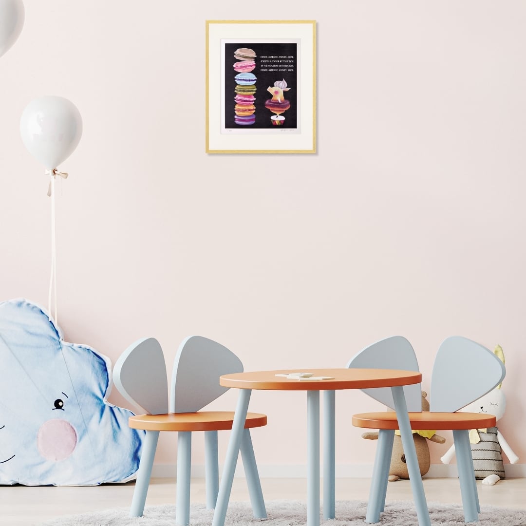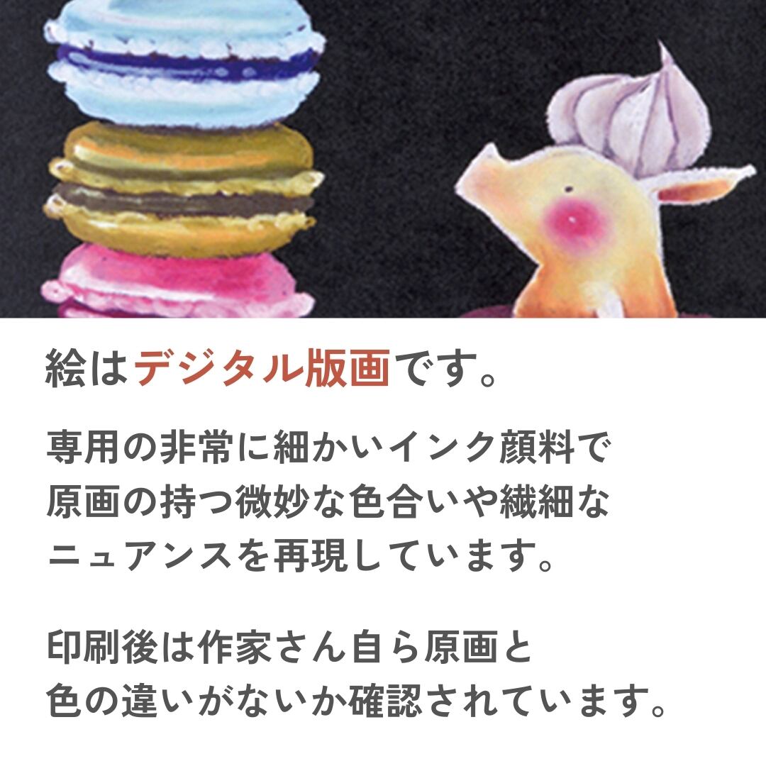 カラフルなマカロンが高く積み上げられ、その横でクリームを頭にのせたブタがドーナツに包まれながら立っている、なんとも愛らしいイラストです。リズミカルな英語の童謡「EENIE, MEENIE, MINEY, MOE」の詩が添えられ、軽やかでポップな雰囲気が広がります。黒を背景にした構図が鮮やかな色彩を引き立て、スイーツの質感や柔らかな立体感が際立っています。見ているだけで心が弾み、日常にちょっとした幸せとユーモアを添えてくれる、魅力あふれるアートです。