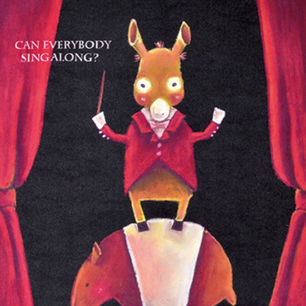 舞台の上でタクトを振るロバと、その下で支えるばく(獏)の姿が印象的なイラストです。深みのある赤いカーテンと黒い背景が、舞台の緊張感と幻想的な空気を演出しています。「CAN EVERYBODY SING ALONG?」というメッセージが、まるで観客に呼びかけるように配置され、見る人をこの小さな劇の世界へと引き込みます。キャラクターの表情やポーズからは、楽しさと真剣さが同居する不思議な魅力が感じられます。ユーモアとドラマ性を併せ持つ、個性的で印象深いアート作品です。