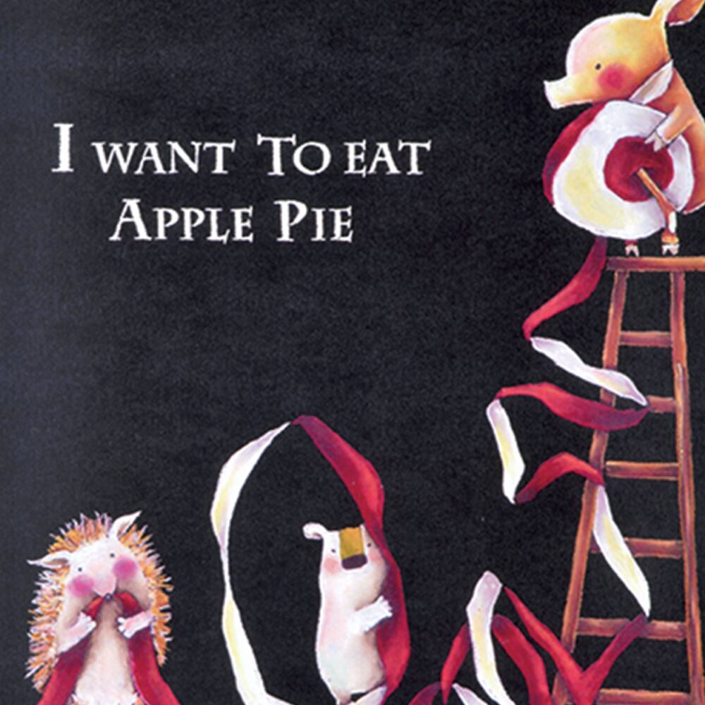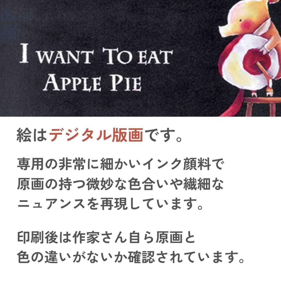 黒い背景の中に、愛らしい動物たちがりんごの皮を長くむきながら遊ぶ様子が描かれたイラストです。梯子の上で皮をむくブタ、その下でリボンのような皮を手にするハリネズミとシロクマの表情がとてもチャーミング。タイトルの「I WANT TO EAT APPLE PIE」というメッセージが、素直で可愛い気持ちを引き立てています。鮮やかな赤のアクセントが印象的で、柔らかな筆づかいが温かみを感じさせます。小さな物語がぎゅっと詰まったような、見ていて心が和むイラストアートです。