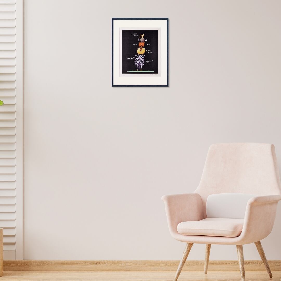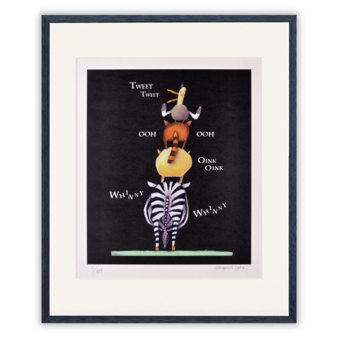 シマウマの背にブタ、ロバ、そして鳥が乗ったユーモラスな構図が印象的なイラストです。まるで童話「ブレーメンの音楽隊」のような世界観で、それぞれの動物が声をあげる文字「TWEET」「OINK」「WHINNY」がリズミカルに配置されています。黒を基調とした背景がキャラクターたちの鮮やかな色を引き立て、シンプルながらも躍動感あふれる仕上がり。どの動物も丸みを帯びたフォルムで表情豊かに描かれ、かわいい絵本のワンシーンのような温もりを感じさせるインテリアアートです。