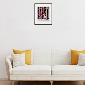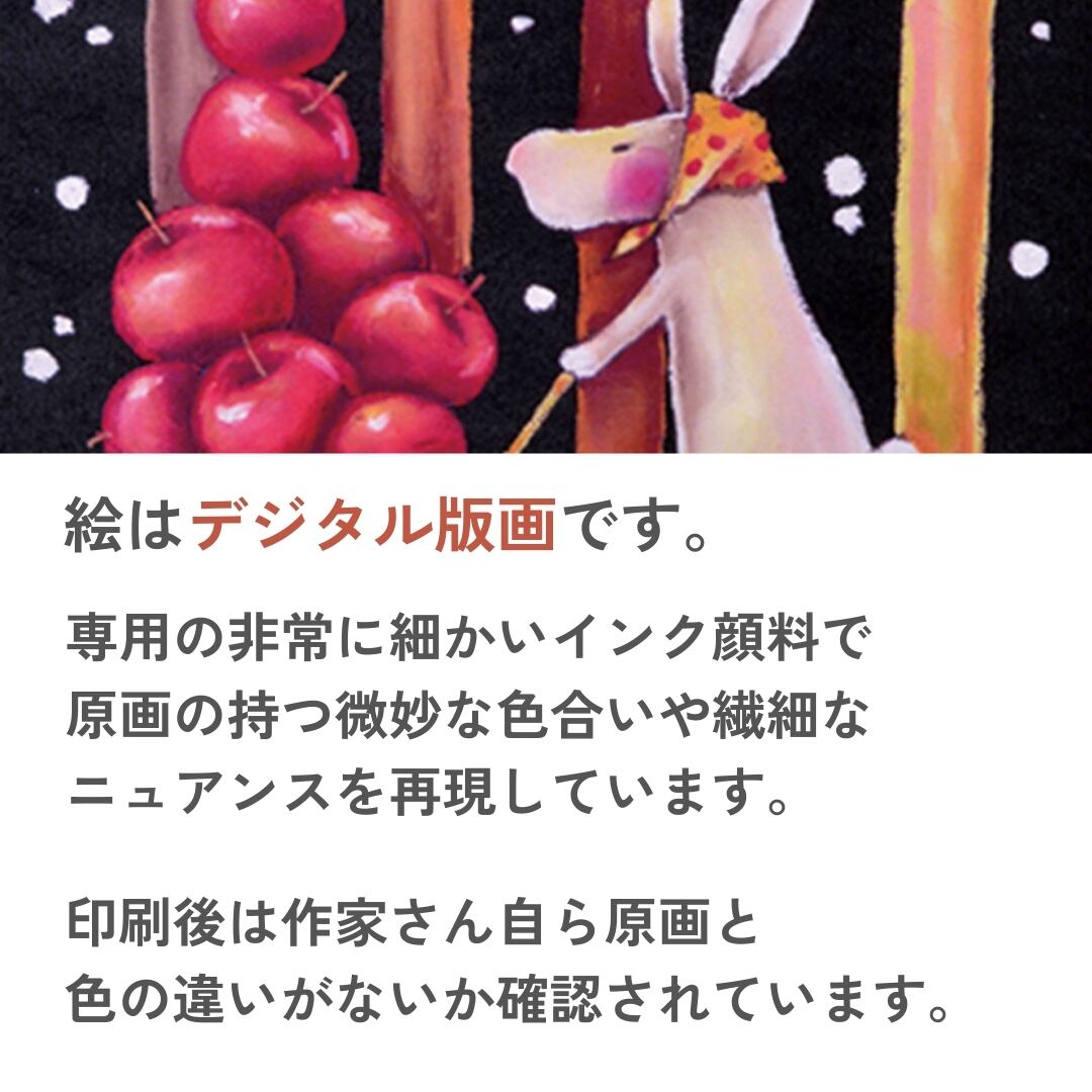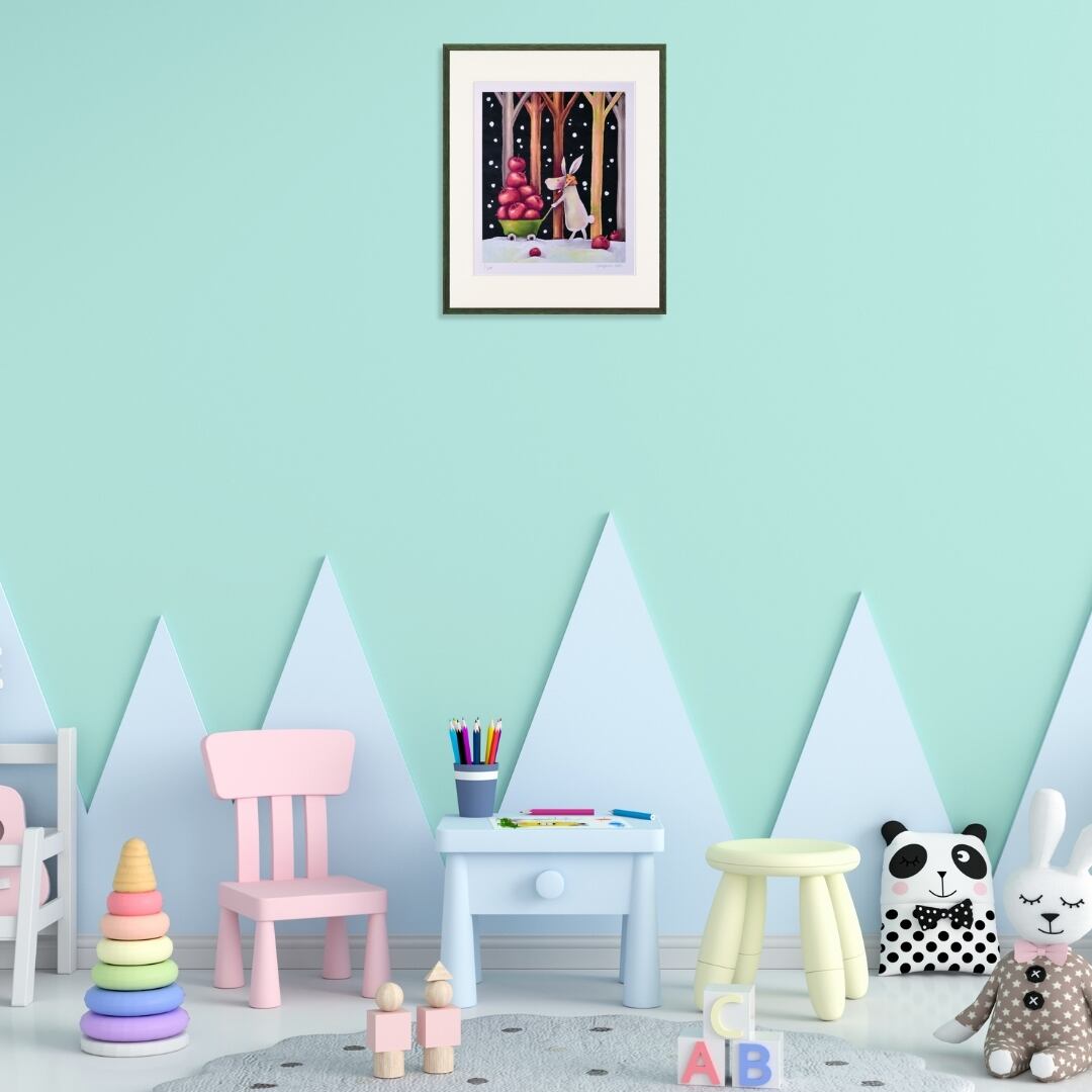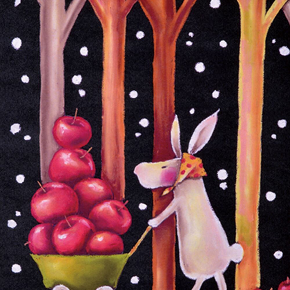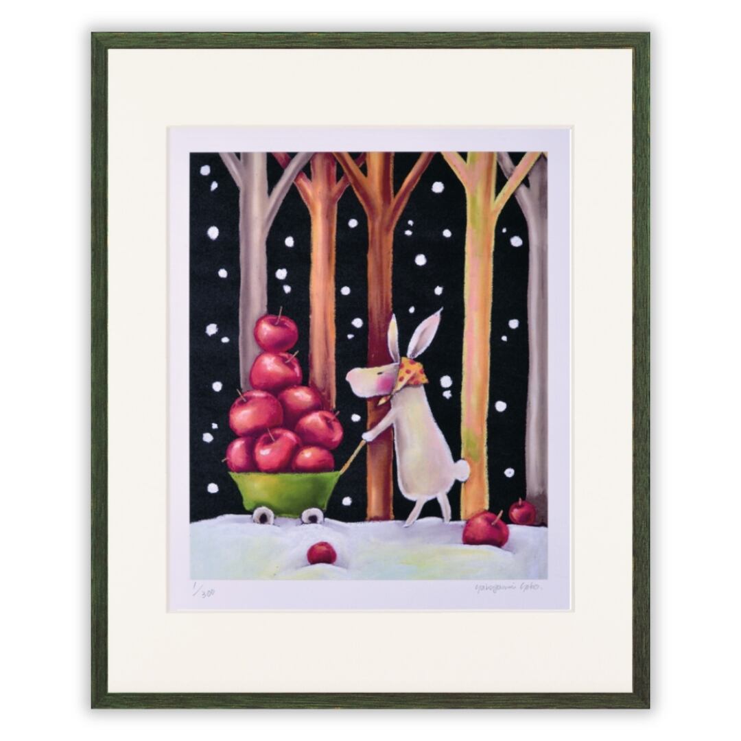 雪の森を舞台に、スカーフを巻いたうさぎが山盛りのリンゴを運ぶ姿が描かれた、心温まるイラストです。白い雪と深い黒の夜空の対比が美しく、静寂の中に小さな物語が息づいています。赤いリンゴが鮮やかなアクセントとなり、冷たい冬の景色にやさしい温もりを添えています。うさぎの素朴な表情と、手描きの柔らかなタッチが見る人の心を和ませる、優しさあふれるインテリアアート。まるで絵本の一場面のように、想像をかき立てる魅力的な作品です。