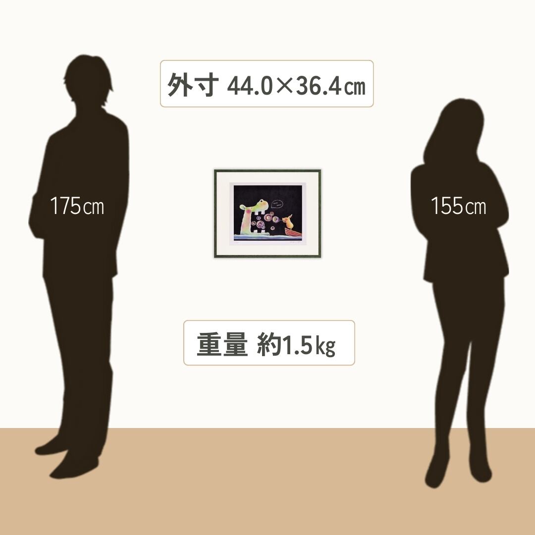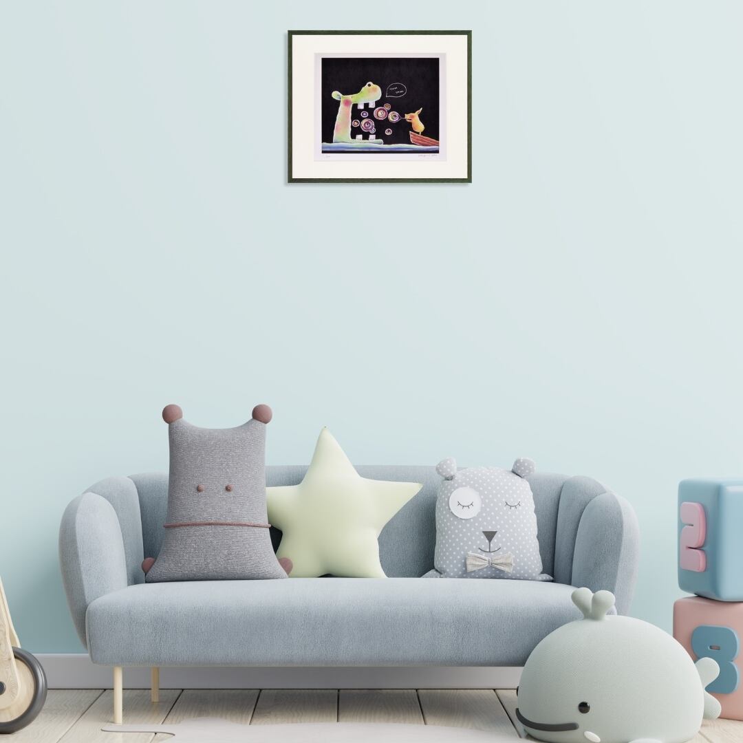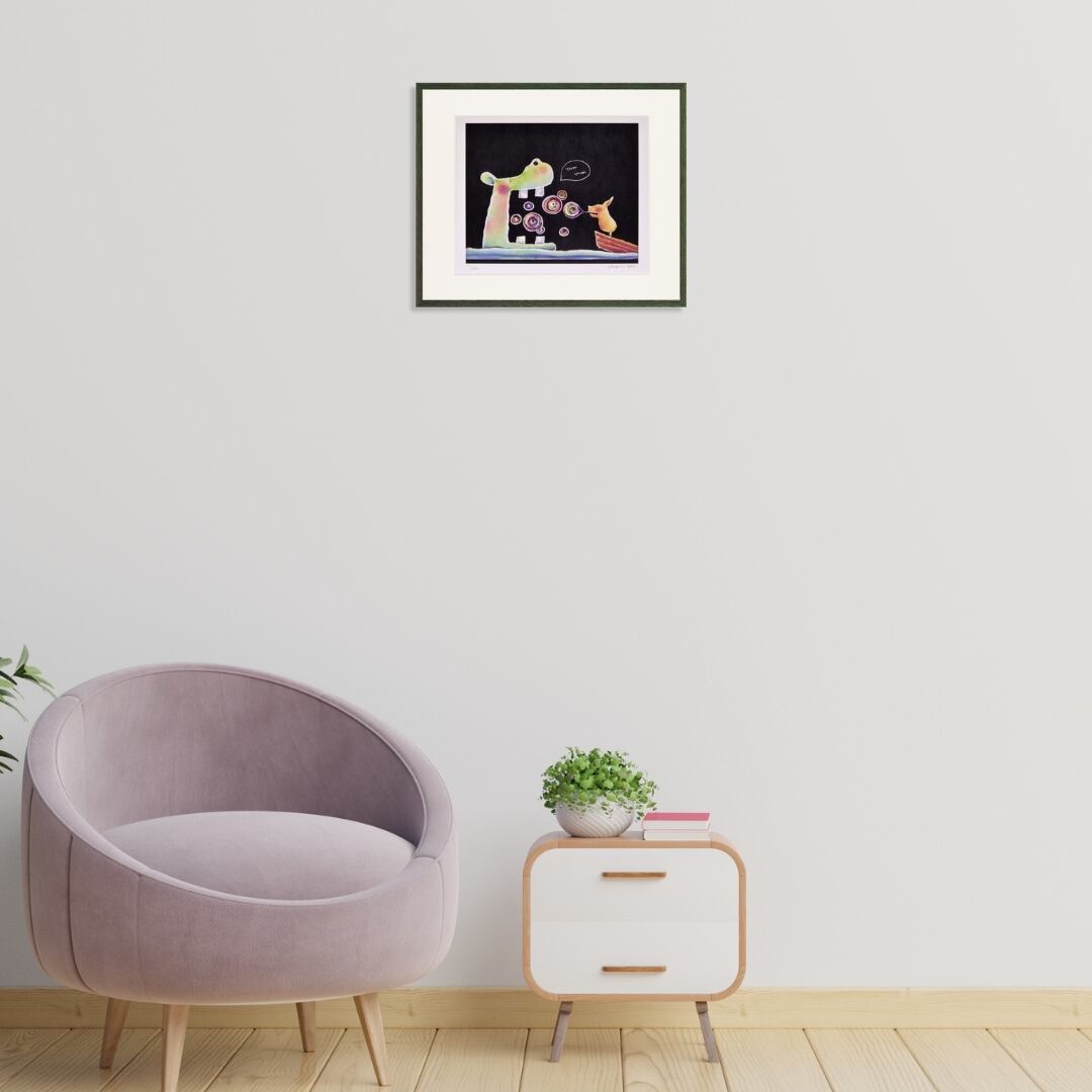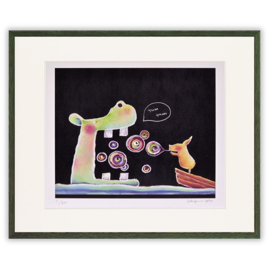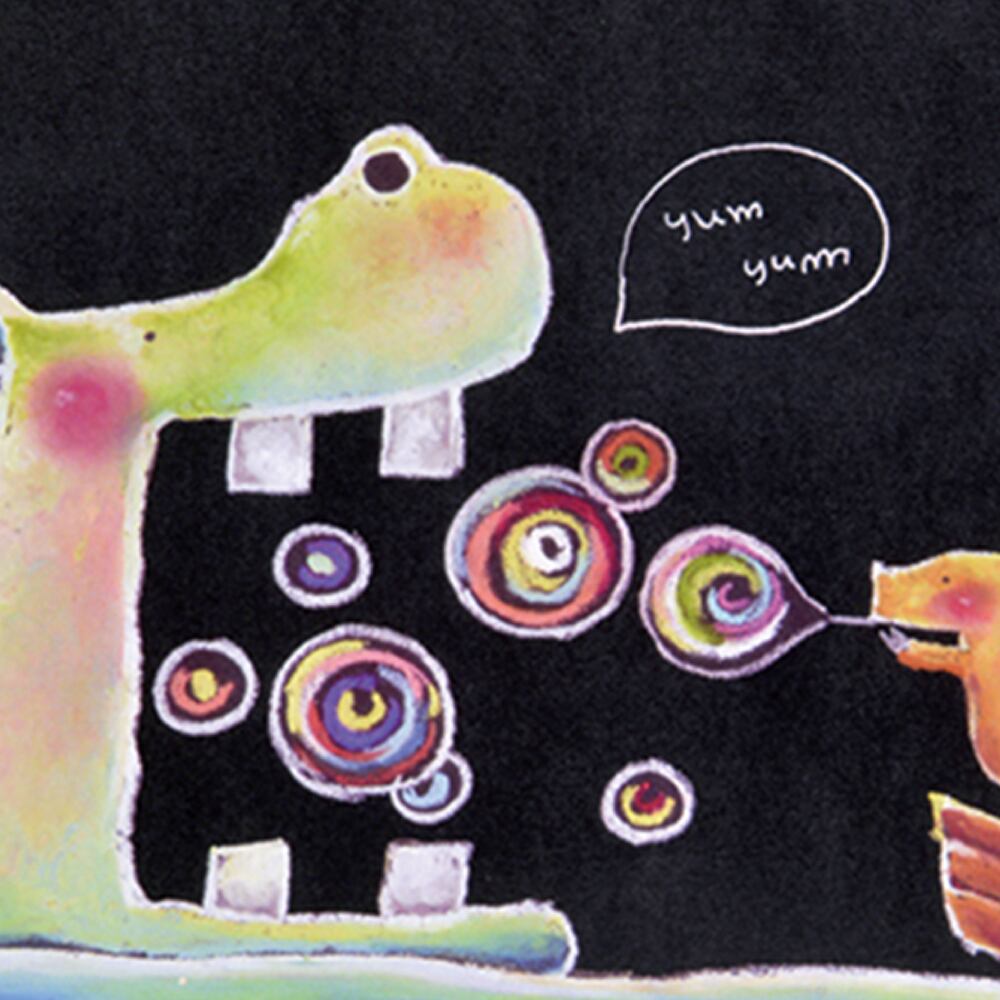 大きなカバと小さな動物が向かい合う、やさしいユーモアにあふれた一枚です。作品内には「yum yum(おいしいね)」という吹き出しが描かれ、カバがシャボン玉を食べるように楽しむ姿が微笑ましく表現されています。黒い背景にカラフルなシャボン玉が浮かび、光を感じるような柔らかな色彩が印象的。シンプルな構図ながら、どこか童話の一場面のような世界観を感じさせるインテリアアートです。観るたびに心が和み、思わず笑顔になるような温かい魅力を放っています。
