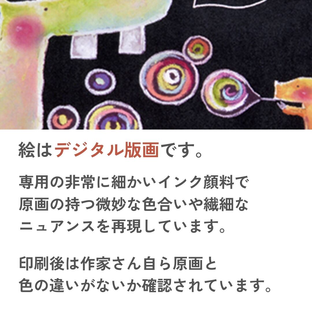 チョークアートで多数の実績を持つ「やぶがみようこ」の作品が版画になりました。可愛らしくてちょっとユニークな動物たちによる癒しのアートです。