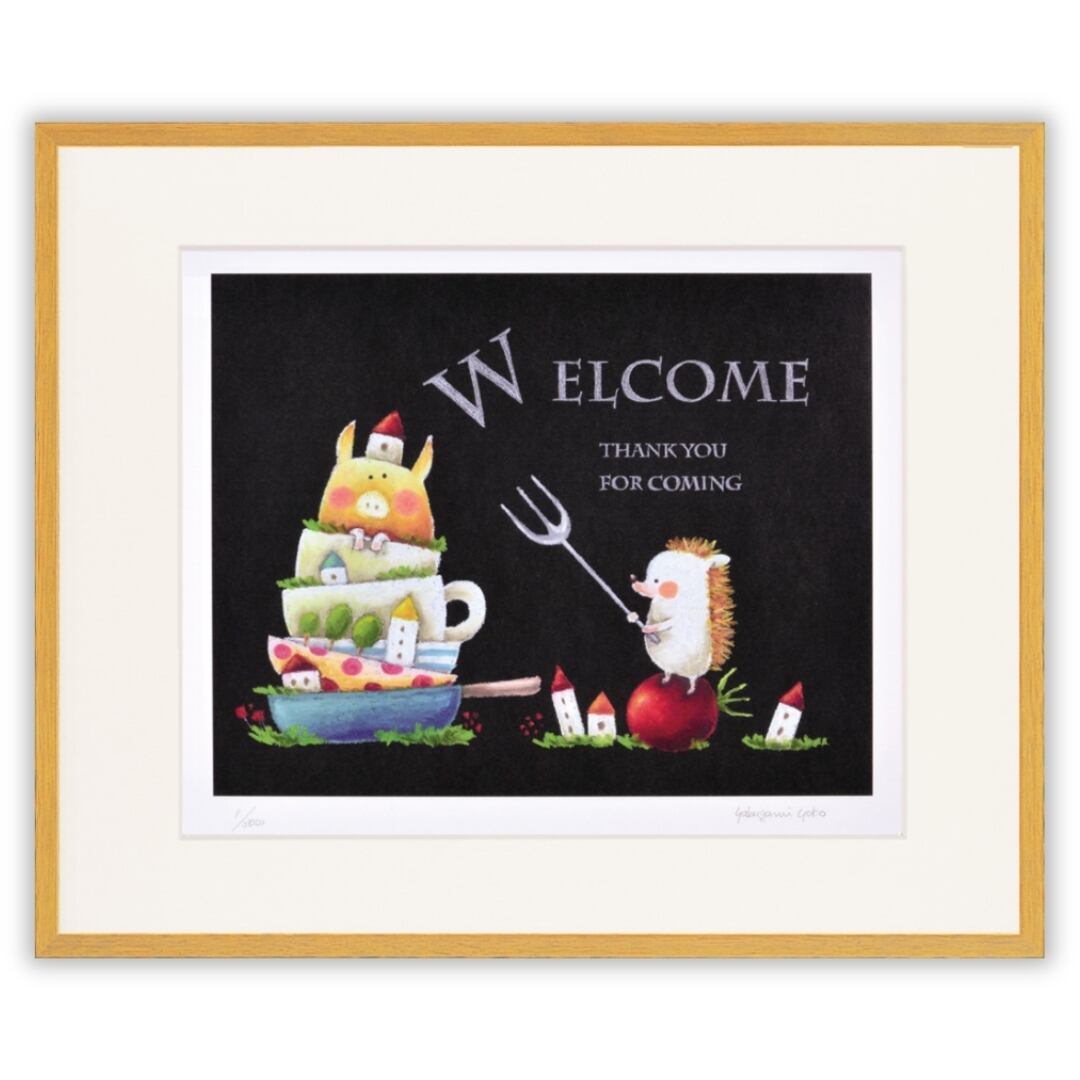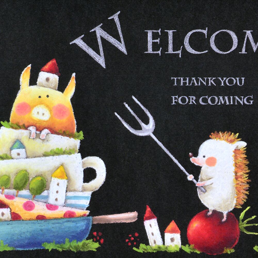 作品に描かれた文字「WELCOME THANK YOU FOR COMING(ようこそ、来てくれてありがとう)」があたたかな印象を与える、ほほえましい一枚です。