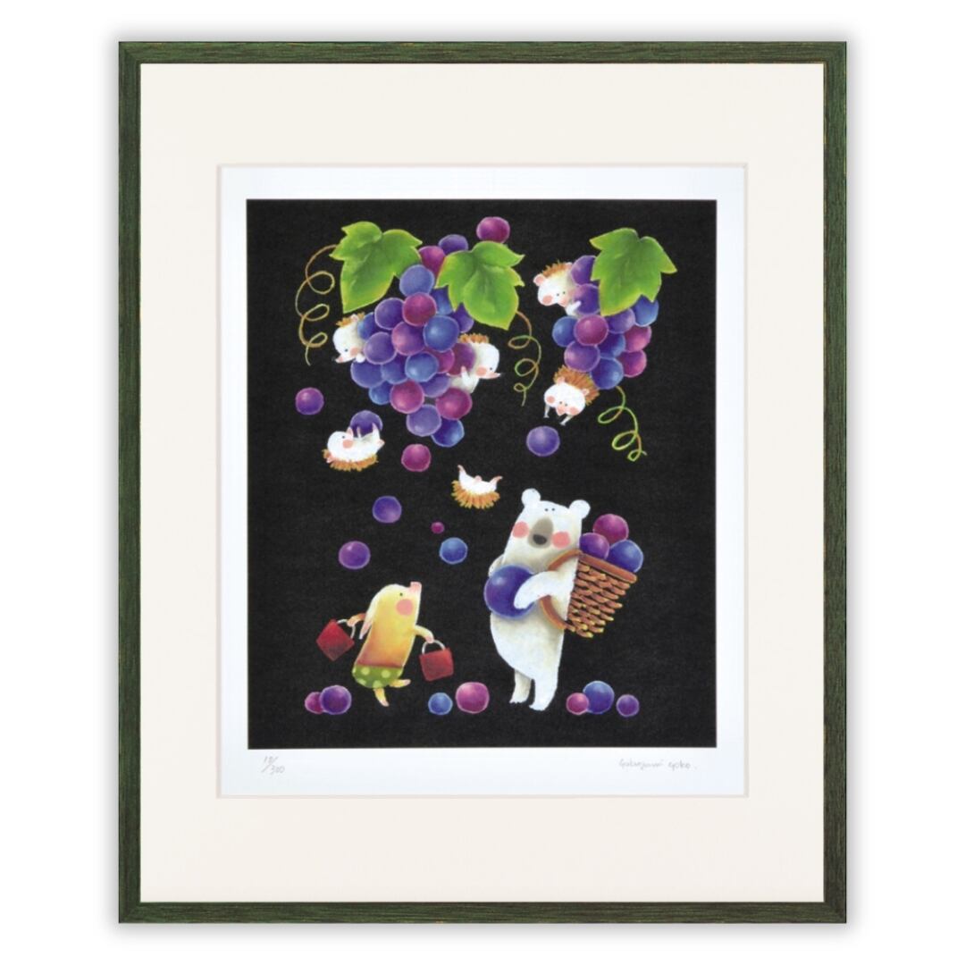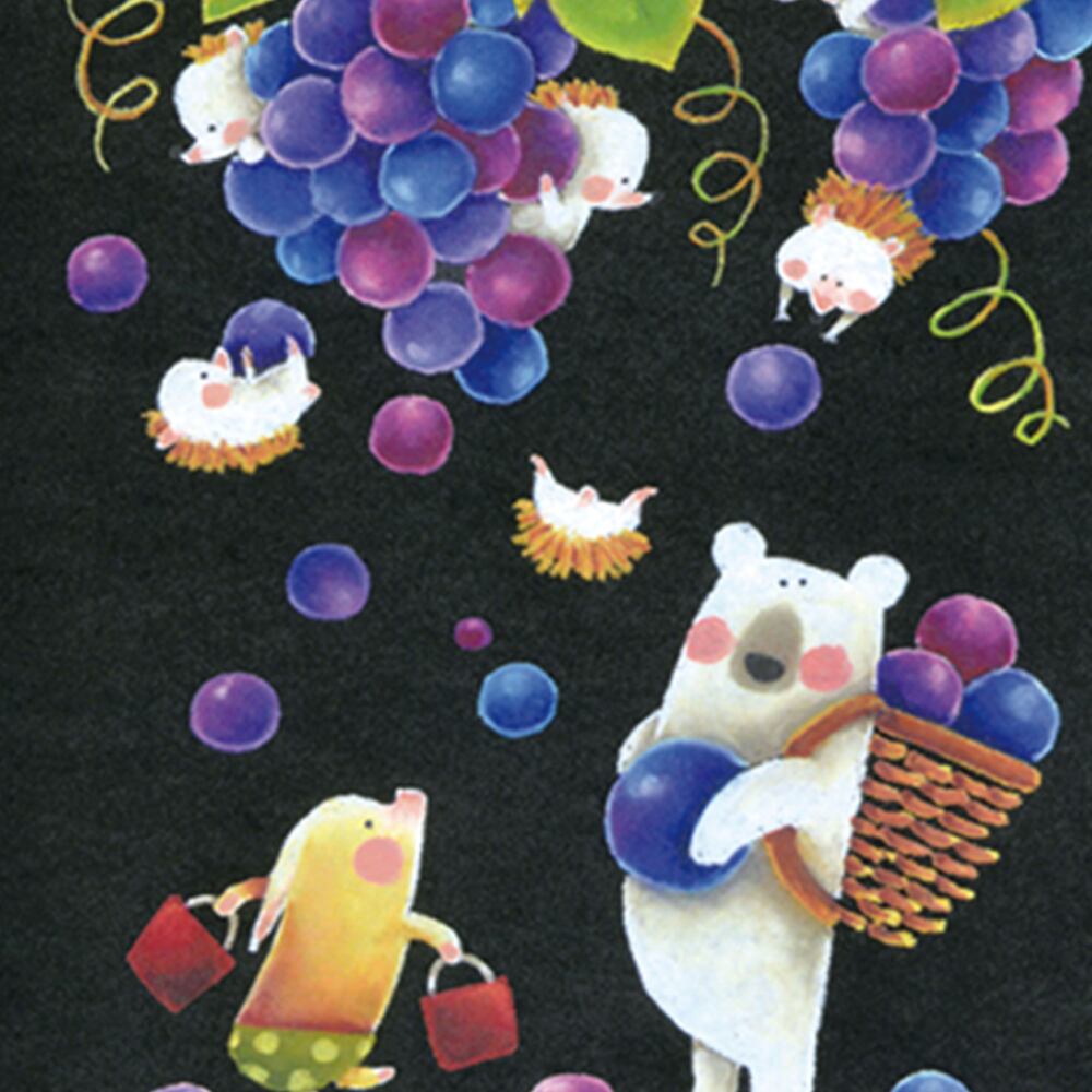 黒い背景に鮮やかな紫のぶどうが映える、楽しくも幻想的な一枚です。大きなぶどうの房からハリネズミたちが顔を出し、まるで果実の間でかくれんぼしているかのよう。下では白くまが籠を抱え、落ちてくるぶどうを受け止めています。隣では黄色いキャラクターが赤いバスケットを手にしており、にぎやかで温かな収穫の時間が描かれています。