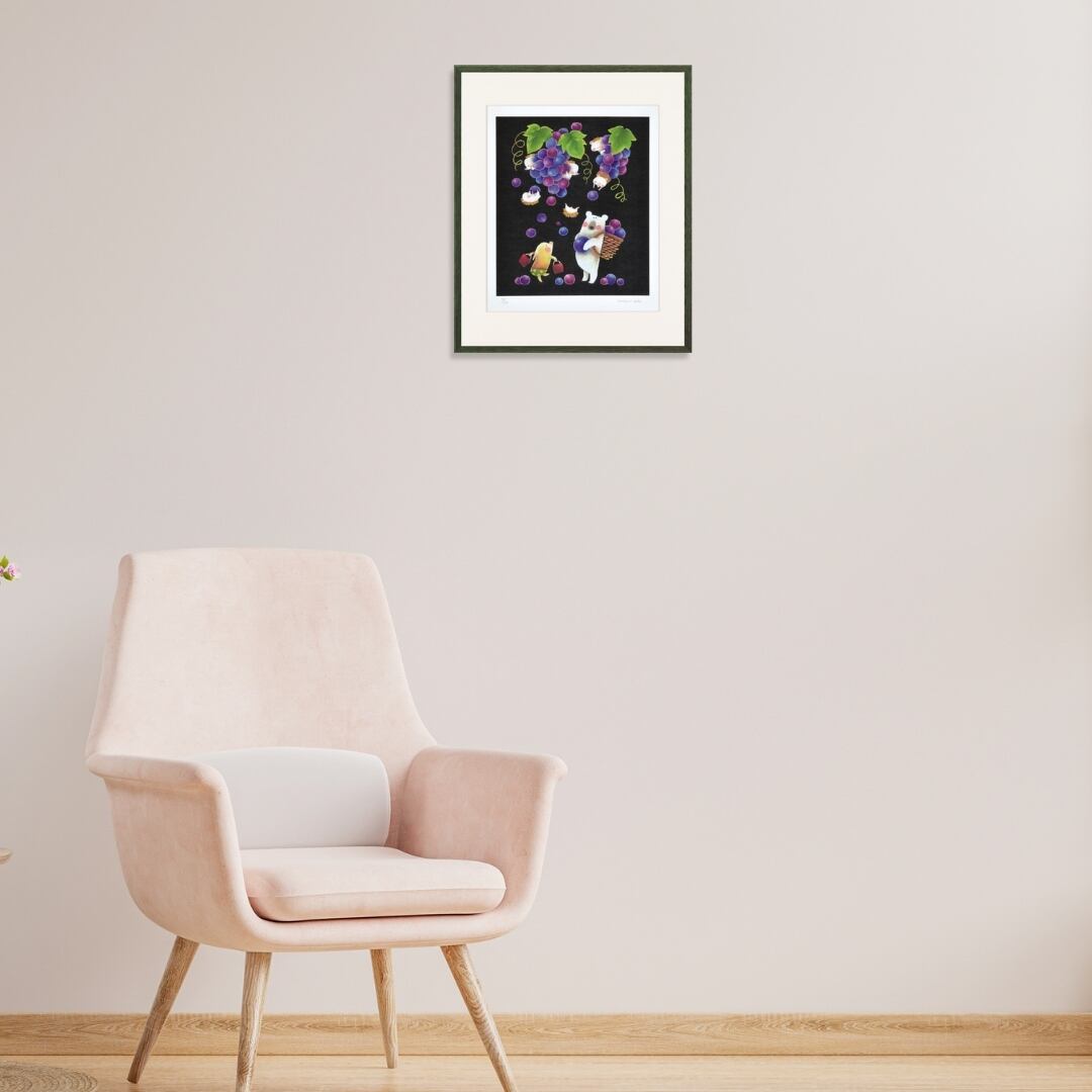 この額縁付きインテリアアートは、空間に自然の恵みと季節の豊かさをもたらしてくれます。黒を基調とした背景が鮮やかなぶどう色を際立たせ、飾るだけで部屋の雰囲気に深みと彩りを与えます。