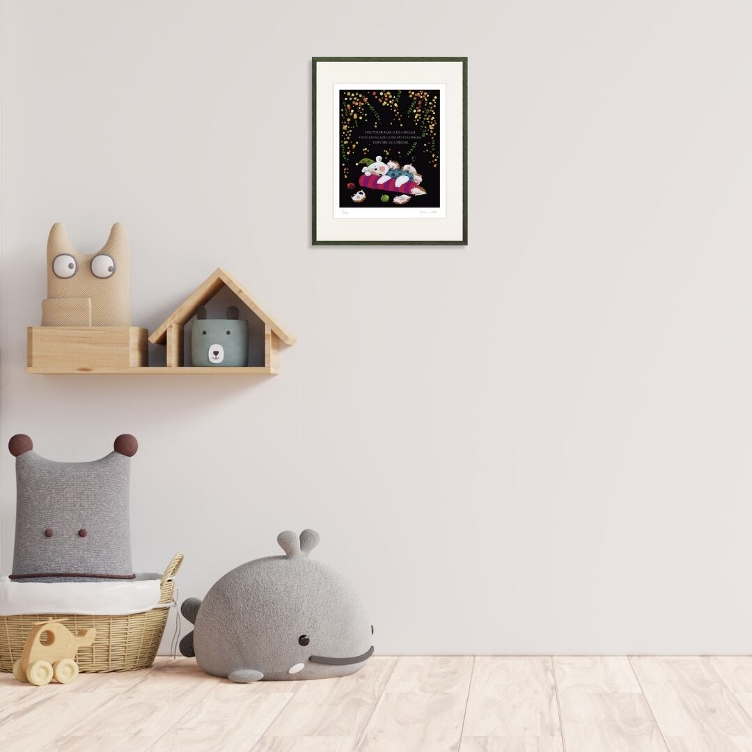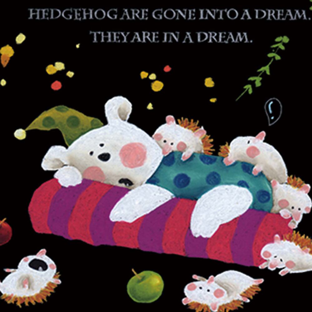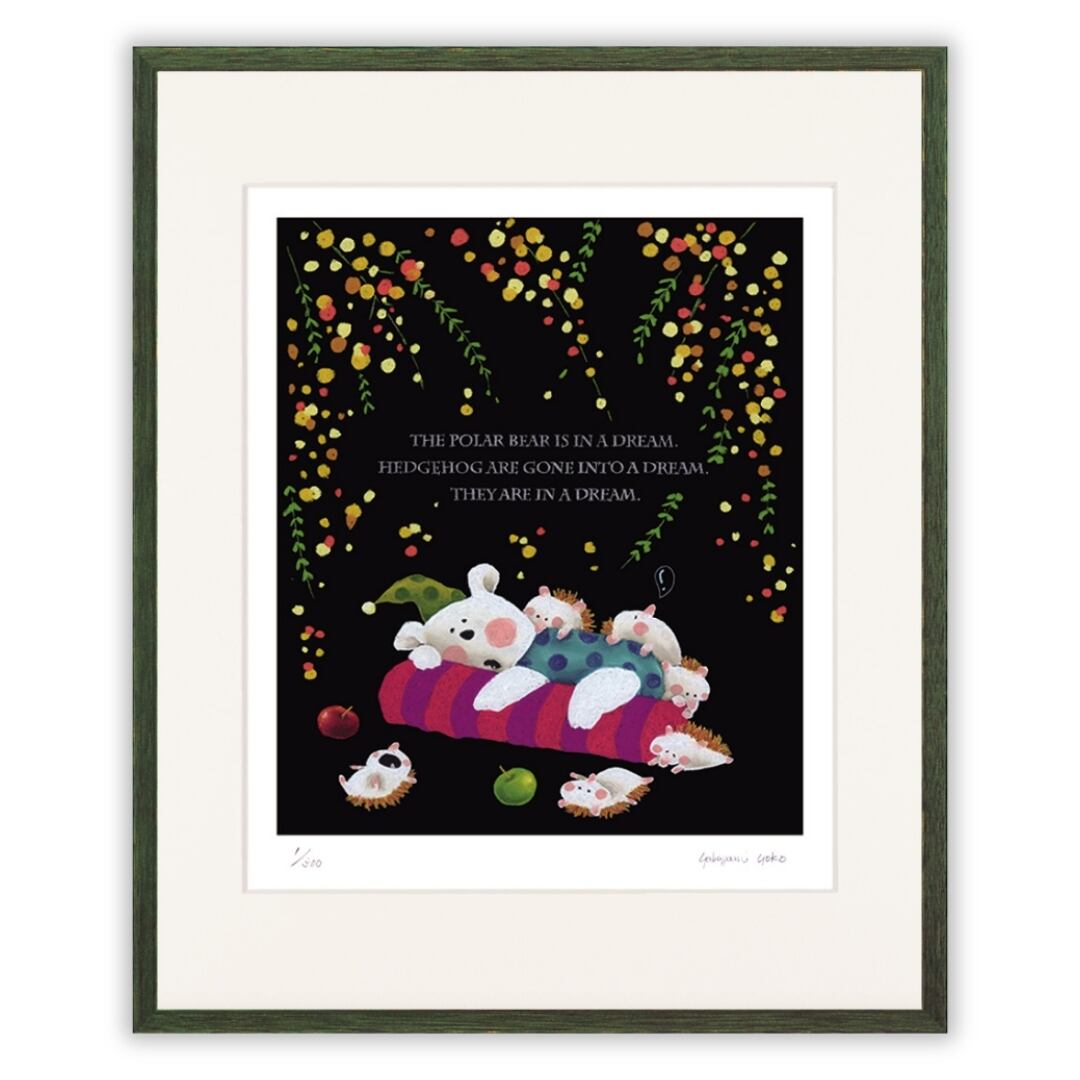 作品に添えられた言葉は “THE POLAR BEAR IS IN A DREAM. HEDGEHOG ARE GONE INTO A DREAM. THEY ARE IN A DREAM.”(白くまも、ハリネズミたちも、夢の中)。