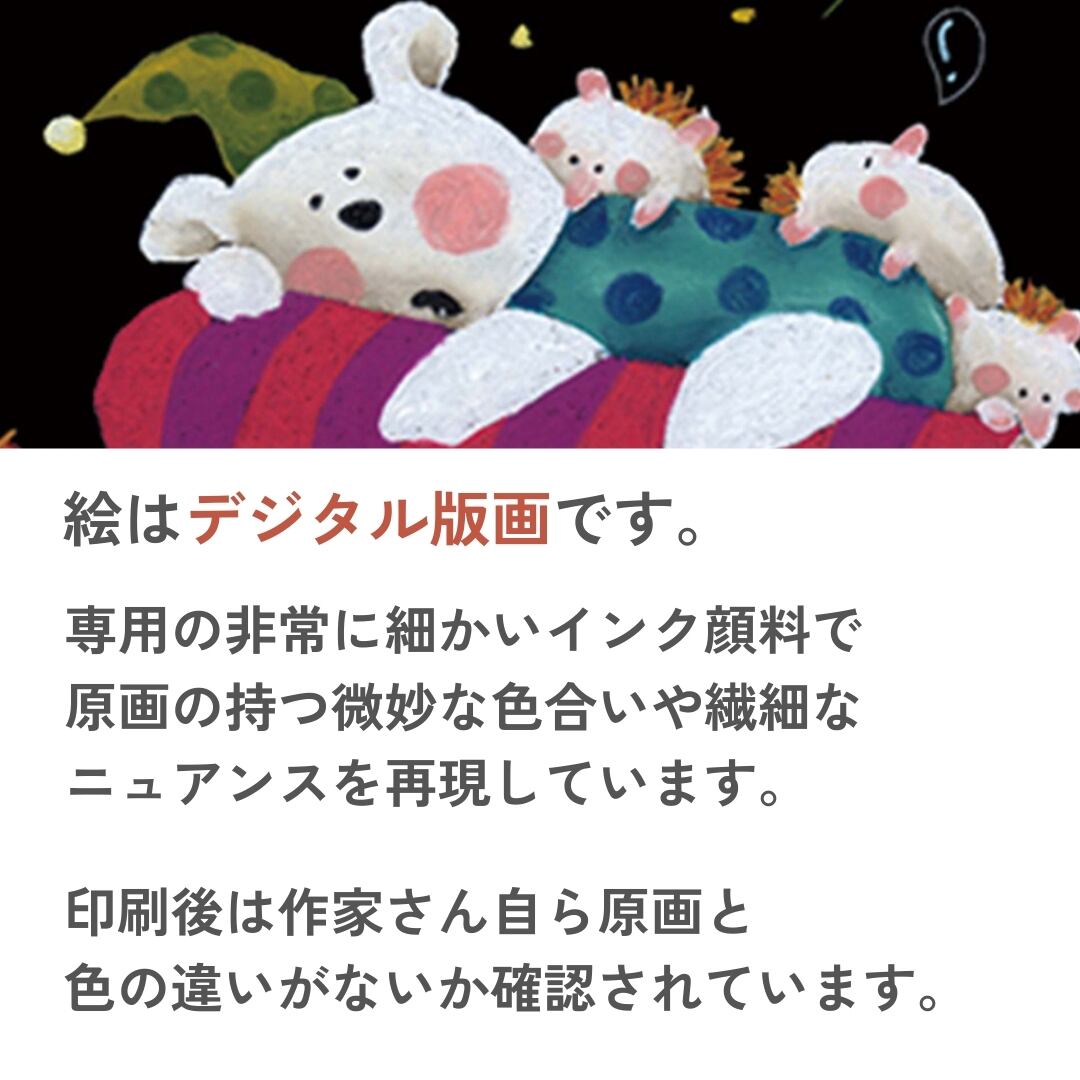 チョークアートで多数の実績を持つ「やぶがみようこ」の作品が版画になりました。可愛らしくてちょっとユニークな動物たちによる癒しのアートです。