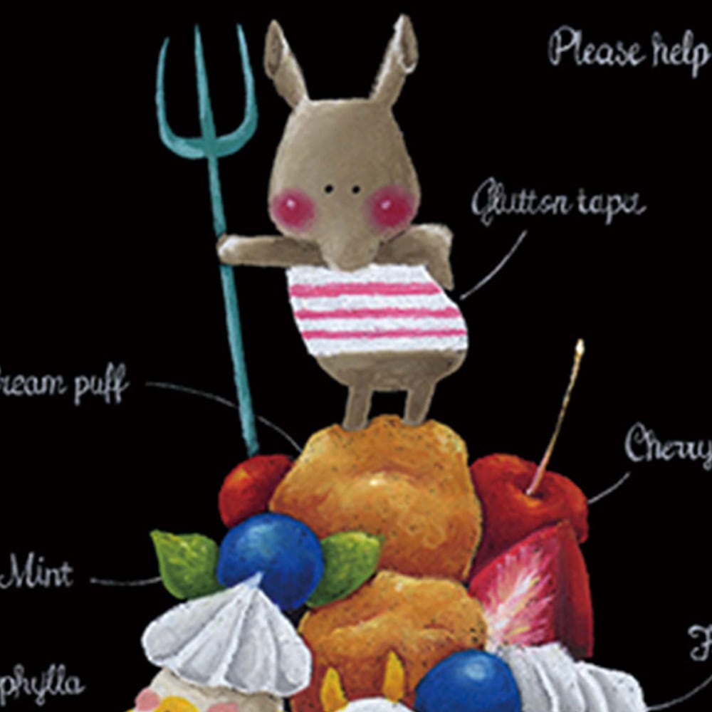 作品に添えられたメッセージは “I made roasted croquembouche. Please help yourself.”(クロカンブッシュを作ったよ、どうぞ召し上がれ)。ピンクの水玉模様の皿の上には、クリームパフやいちご、ブルーベリー、ミントなどが彩りよく重なり、まるでお菓子の塔のように美しく積み上げられています。その上に立つウサギのようなキャラクターが、誇らしげにフォークを掲げる姿が印象的。ひとつひとつのパーツが緻密に描かれ、可愛らしさとともに作品全体に温かい手作り感が漂います。黒の背景が色鮮やかなスイーツを引き立て、見る人の心をくすぐるような甘い世界観が広がっています。
