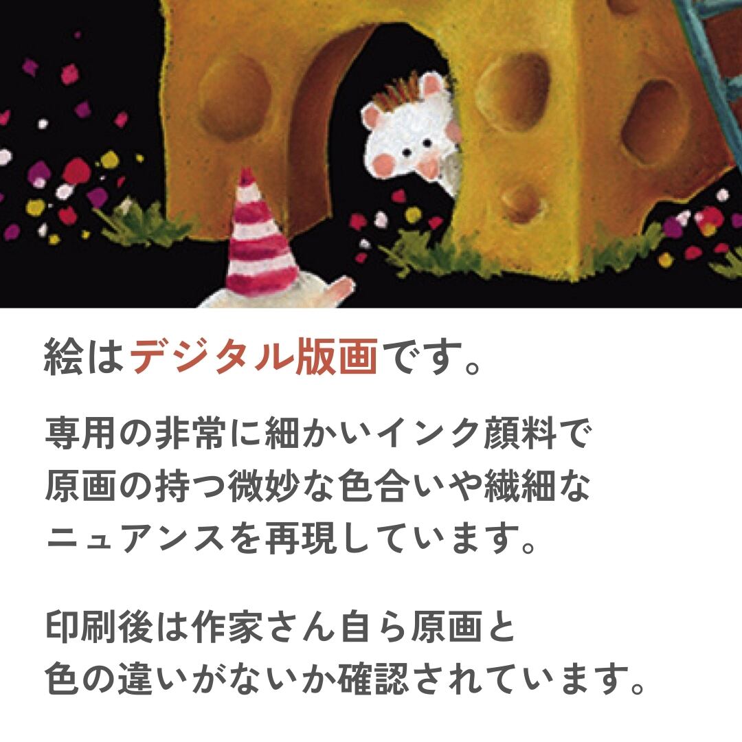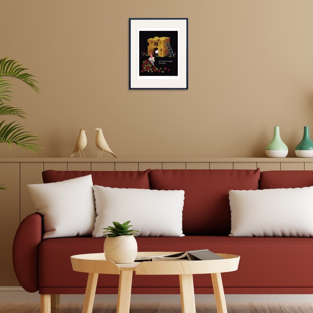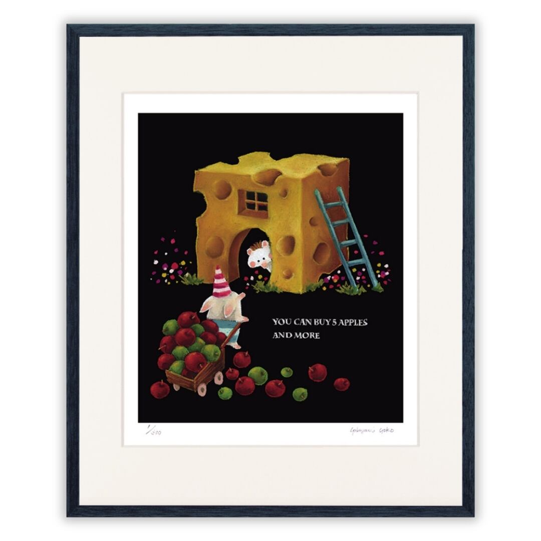 「YOU CAN BUY 5 APPLES AND MORE」と描かれたこの作品は、チーズのような家と、赤と緑のリンゴを運ぶキャラクターたちの可愛らしい世界が広がっています。チーズの穴からのぞくハリネズミの表情や、カートいっぱいに積まれたリンゴの鮮やかな色合いが印象的。黄色と赤と緑のバランスが絶妙で、どこか童話の一場面のようなあたたかみを感じさせます。背景の黒が果物やキャラクターを際立たせ、作品全体に立体感と物語性を与えています。細部まで丁寧に描かれた筆致により、見ているだけでワクワクするような幸福感が漂います。