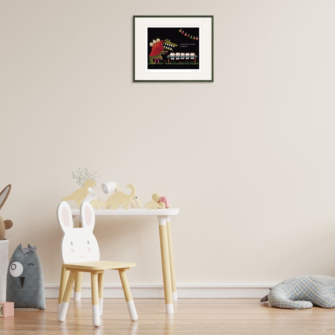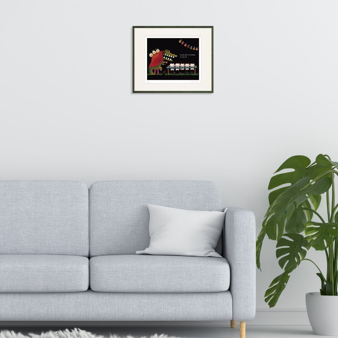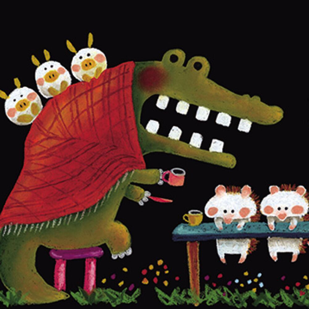 「THERE ARE NO CHAIRS TO SIT ON...(座るイスがないの)」という言葉とともに描かれた、なんともユーモラスな場面。赤い毛布を羽織ったワニが一脚の椅子にちょこんと座り、前には小さなハリネズミたちがテーブルに並んでお茶を楽しんでいます。ハリネズミたちは椅子がないため、足をぷらぷらと宙に浮かせている姿がなんとも愛らしく、見ているだけでくすっと笑ってしまうような温かい光景です。背景の黒がテーブルの明るい青や毛布の赤を引き立て、可愛らしさとおしゃれさを兼ね備えた構図になっています。上部に吊るされた小さな動物形のガーランドも、遊び心あふれるアクセントとして印象的です。