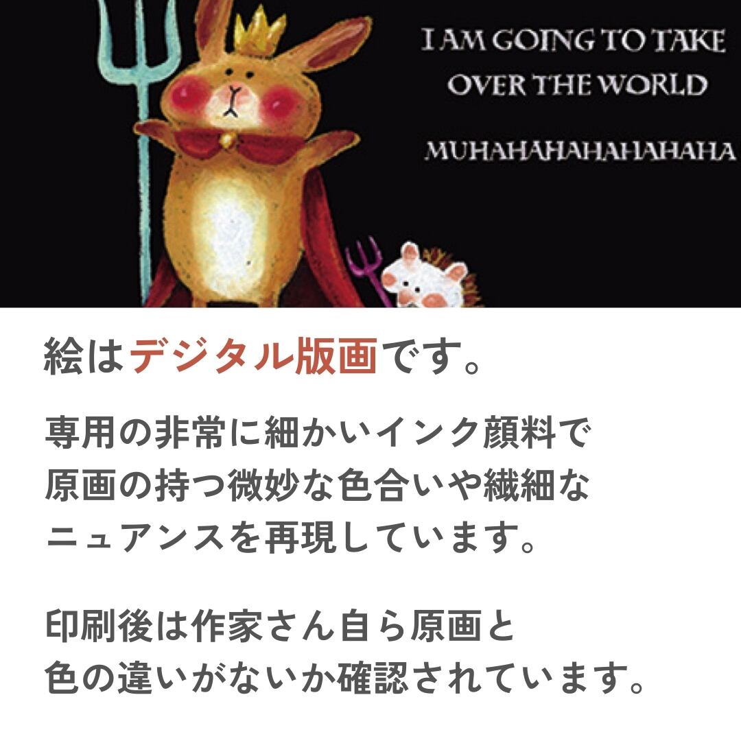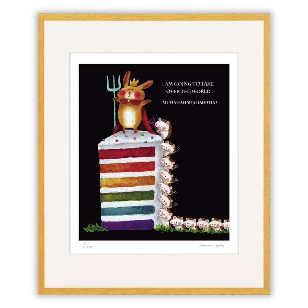 「I AM GOING TO TAKE OVER THE WORLD MUHAHAHAHAHAHA!」というセリフが印象的な、ユーモアとかわいさが絶妙に融合した一枚。大きなレインボーケーキの上に王冠をかぶったウサギが立ち、まるで世界征服を宣言しているかのような堂々としたポーズがユーモラスです。その下では、たくさんのハリネズミたちが力を合わせてケーキをよじ登っており、ちょっとした冒険のような躍動感が感じられます。七色のケーキの層が鮮やかに輝き、黒い背景とのコントラストが抜群。楽しげな色彩の中にも緻密な構図があり、見れば見るほどストーリーを想像したくなる作品です。