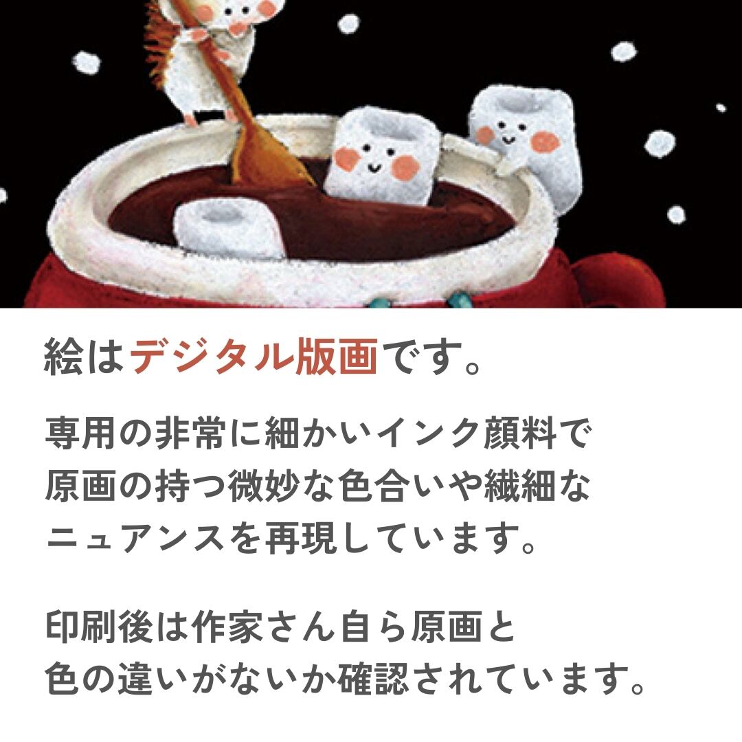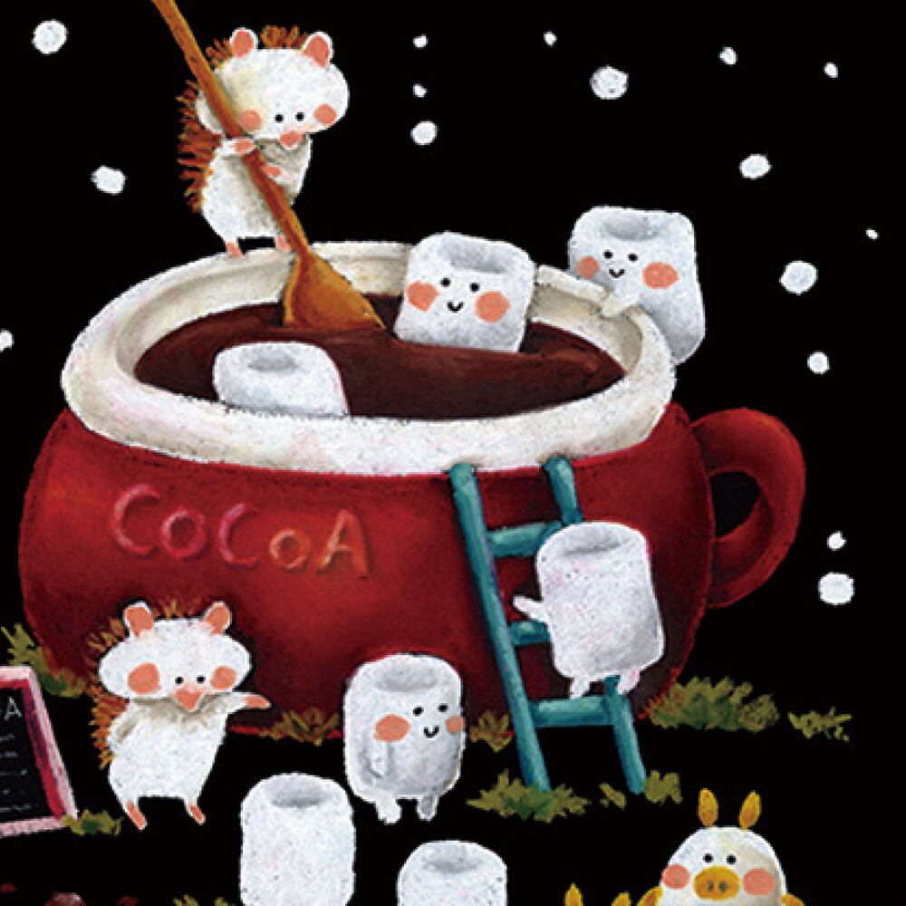 「HOW WOULD YOU LIKE A CUP OF COCOA?」という問いかけとともに、赤いマグカップの中でハリネズミたちがココアをかき混ぜる、なんともあたたかく愛らしい光景が描かれています。カップの中にはふんわりとしたマシュマロたちが浮かび、周りでは次の順番を待つように仲間たちが楽しそうに集まっています。背景に舞う白い雪のような模様が冬のぬくもりを感じさせ、チョコレートの質感も丁寧に表現されていて、甘く優しい香りまで漂ってきそうです。赤とこげ茶、そして白のバランスが絶妙で、冷たい季節の中に温もりと幸せを閉じ込めたような一枚です。