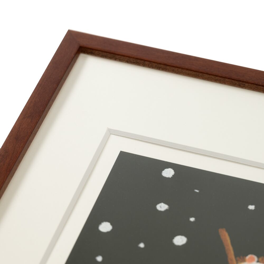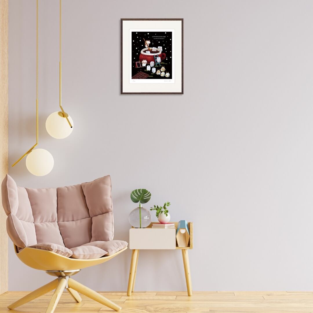 この額縁付きアートは、見ている人の心をふんわりと温めてくれる冬の物語のような作品です。深みのあるブラウンフレームが赤いマグカップをより印象的に引き立て、ナチュラルからモダンまでさまざまなインテリアに調和します。キッチンやダイニングに飾れば、まるでカフェのような雰囲気を演出し、リビングでは家族が集う空間に優しい癒しを添えます。小さなハリネズミたちの表情や、マシュマロの丸いフォルムが見るたびに心をなごませ、忙しい日々の中でもほっと一息つける時間を与えてくれます。ギフトとしても人気が高く、季節を問わず贈ることができるあたたかみのあるアートです。眺めるだけで幸せな気持ちを思い出させてくれる、癒しの一枚です。