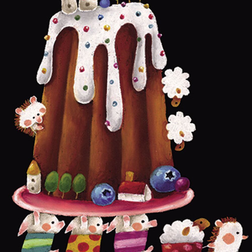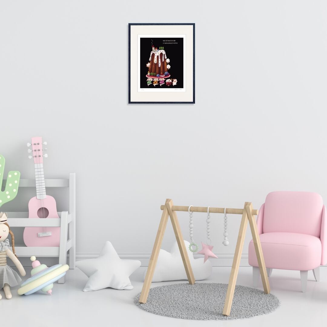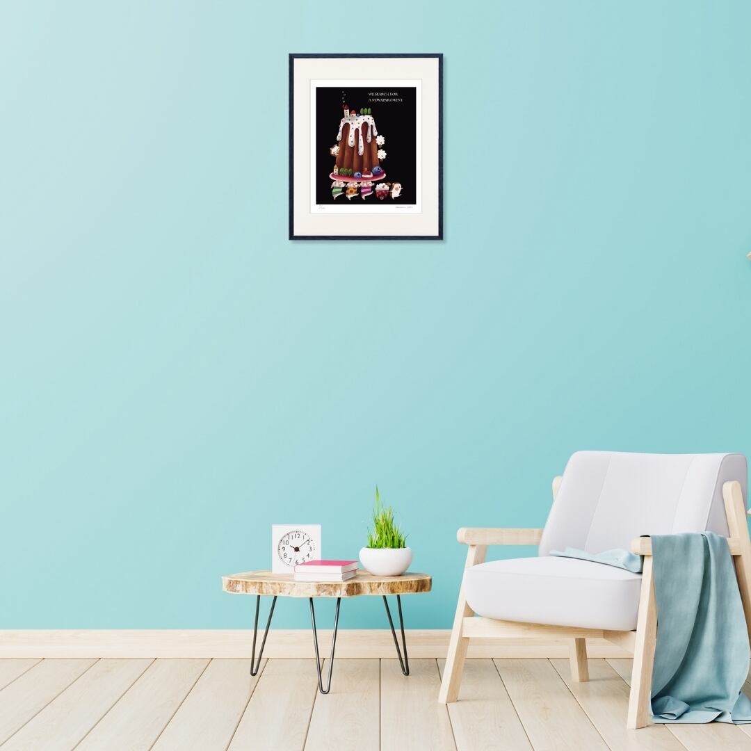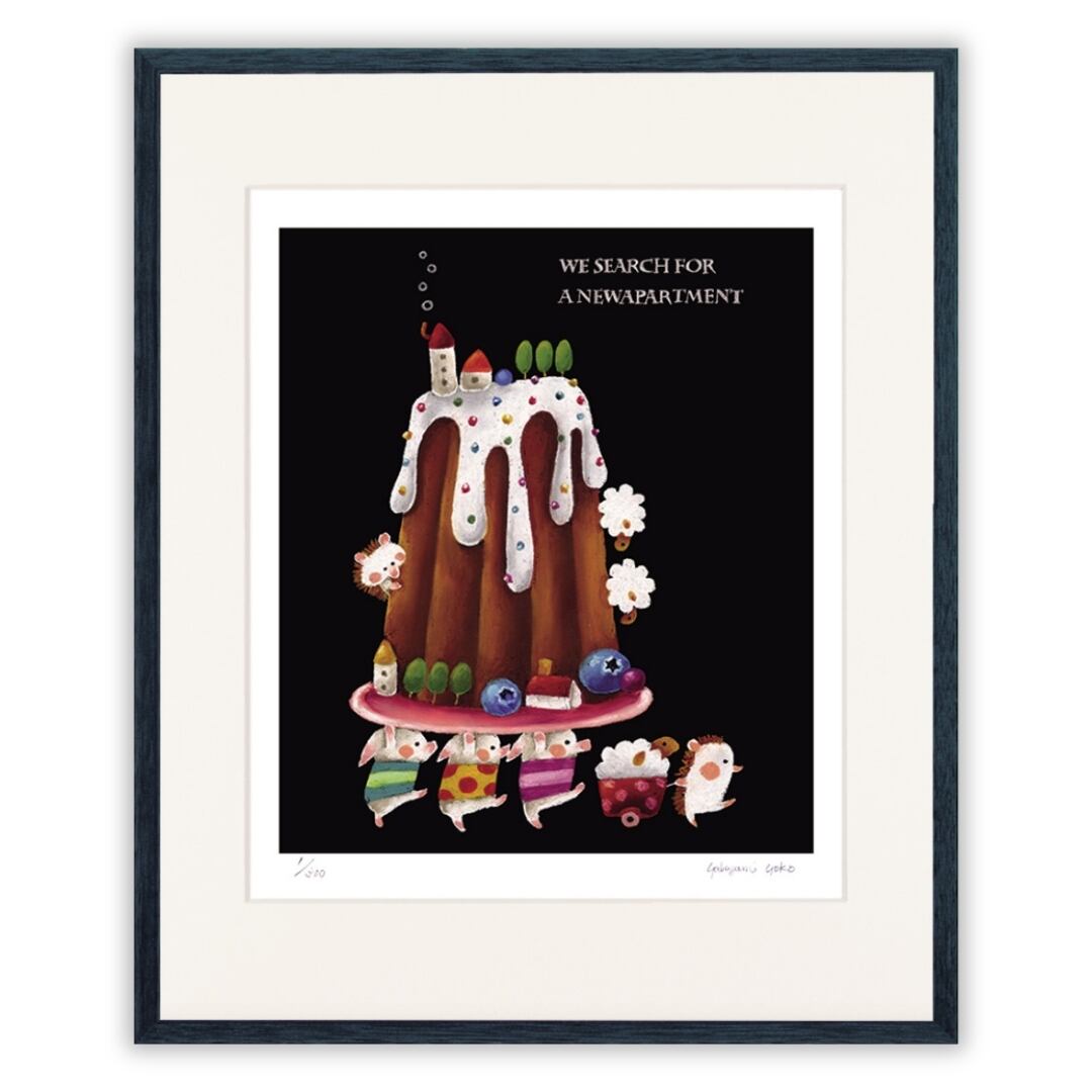 「WE SEARCH FOR A NEW APARTMENT(新しいおうちを探しているの)」という言葉が添えられた、まるで童話の1ページのような作品です。大きなクグロフ型のケーキがまるで丘のようにそびえ、その上には小さなおうちや木々が並び、甘いお菓子の世界に暮らす住人たちの物語を感じさせます。下ではハリネズミやウサギたちが荷物を持って新しい住まいを探して歩いており、まるで引っ越しの行列のように楽しげです。アイシングの白とフルーツの彩りが黒の背景に映え、夢と可愛らしさをぎゅっと詰め込んだような構図。見ているだけでほのぼのとした気持ちに包まれます。