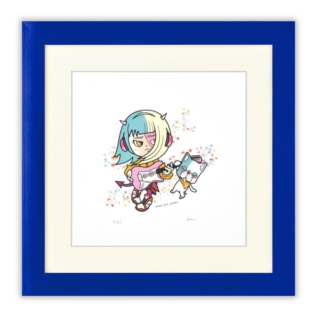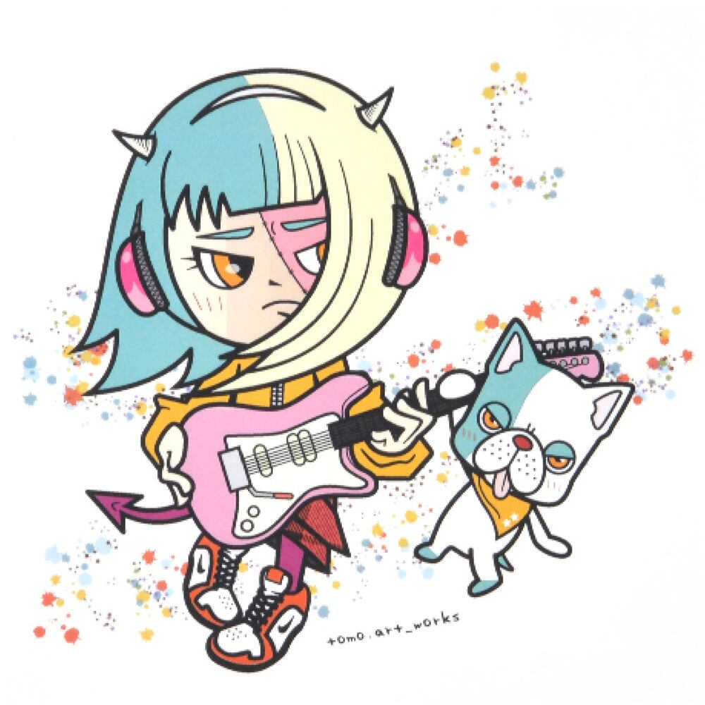少しクールな表情でギターを抱えるキャラクターが印象的な作品。淡いブルーとクリームの髪色、そしてピンクのアクセントが絶妙なバランスで調和しています。そっと寄り添う相棒の犬も、どこか誇らしげな様子。背景のカラフルなスプラッシュがリズム感を添え、まるで音楽が聞こえてくるようなポップな雰囲気を演出しています。見ているだけでおしゃれな遊び心と個性が感じられる、可愛さとスタイリッシュさを兼ね備えた一枚です。