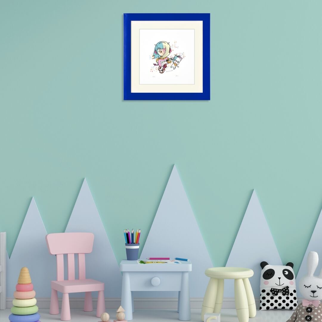 このインテリアアートは、ブルーのフレームが爽やかでスタイリッシュな印象を与えます。白を基調とした部屋にもよく映え、アートを通して空間にリズムと彩りをプラス。おしゃれなポップアートとして、リビングや子ども部屋、ワークスペースに飾れば、日常に遊び心と元気を届けてくれます。明るいカラーが気分を軽やかにし、見るたびに前向きなエネルギーをもらえるインテリアアートです。ギフトにもおすすめの一品です。