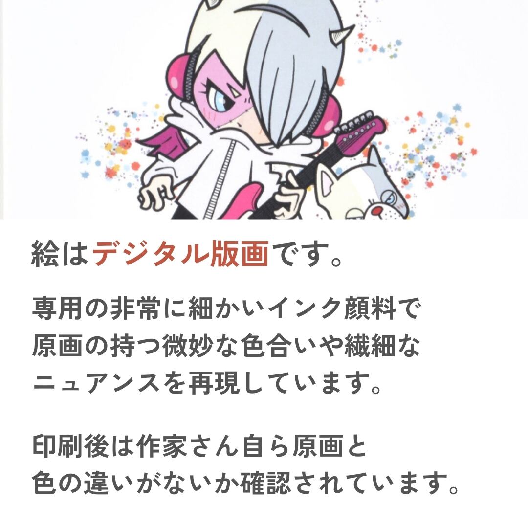 少しクールで物静かな表情が印象的なキャラクターが描かれた作品。淡いグレーの髪に、ピンクのアクセントが映えるスタイリッシュな色使いです。ギターを抱えながらもどこか優しさを感じさせる姿は、静けさの中に情熱を秘めたよう。隣に寄り添う犬の存在が、作品全体にあたたかみを添えています。背景のカラフルなスプラッシュが軽やかに広がり、音楽のリズムと自由なエネルギーを感じさせるポップアートです。