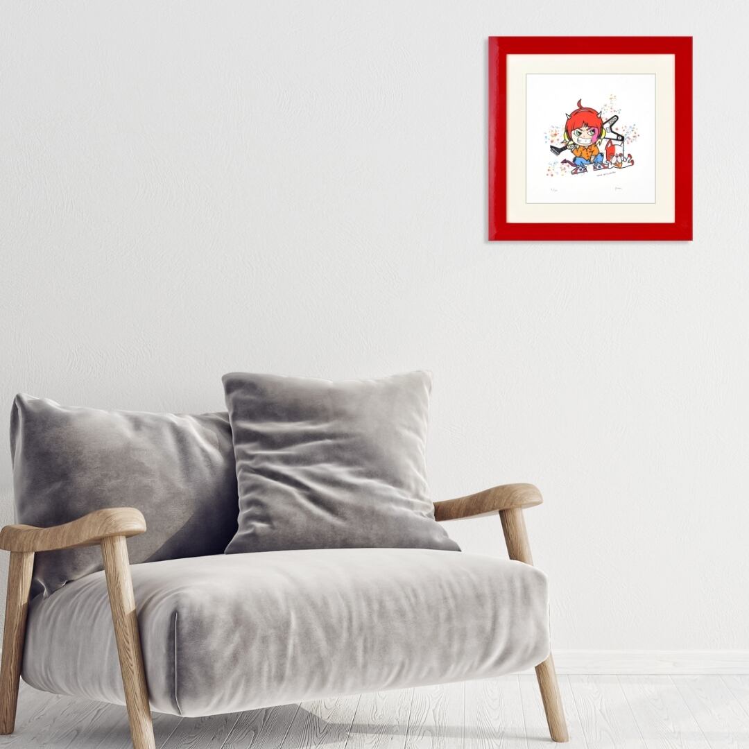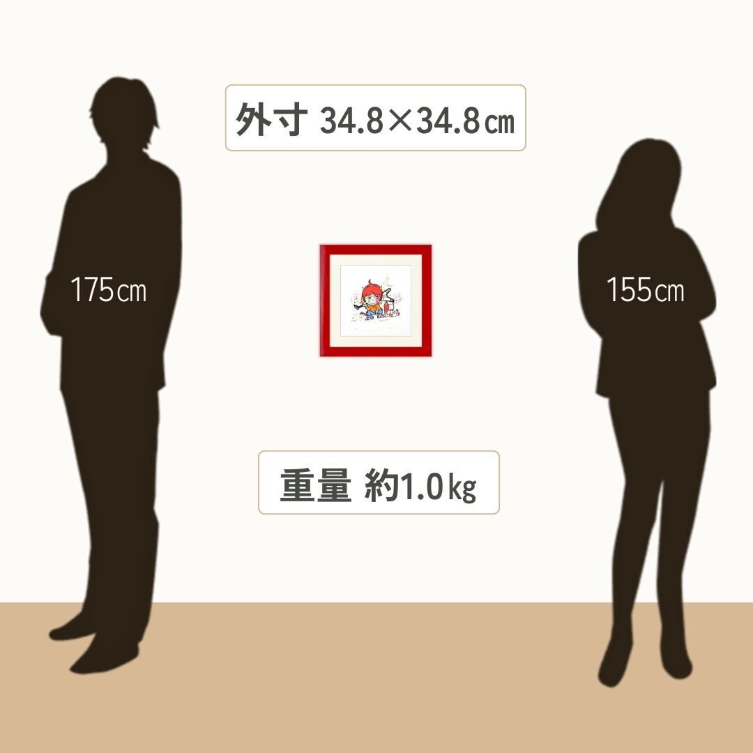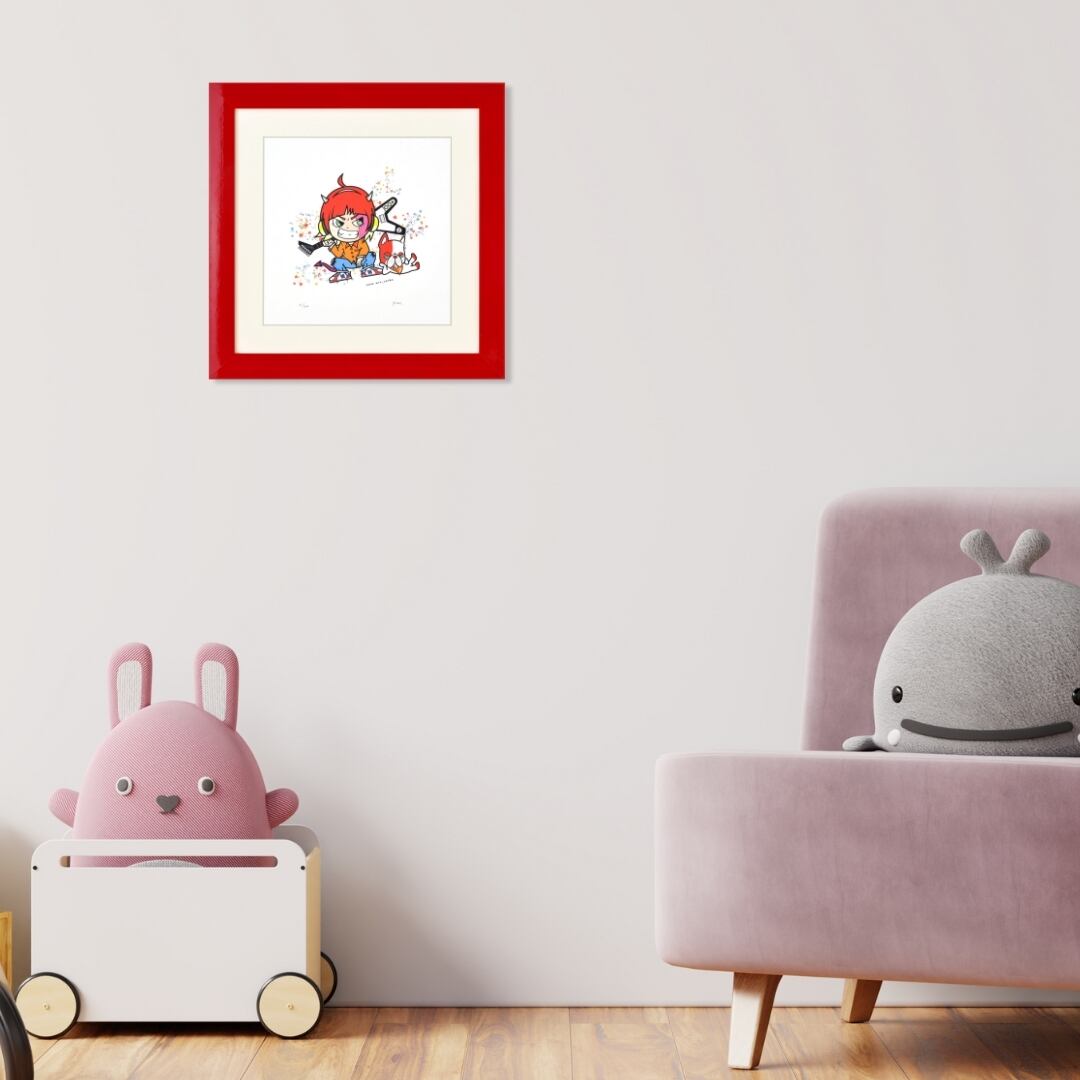 鮮やかなレッドフレームがキャラクターの活発さを引き立て、インテリアに強いアクセントをプラス。白を基調とした部屋やシンプルな空間にもよく映え、飾るだけで元気を与えてくれるアートです。遊び心のあるデザインは、リビングや子ども部屋、カフェのような空間にもぴったり。ポップアートやカジュアルモダンなインテリアとも相性抜群で、毎日を明るく彩ってくれます。