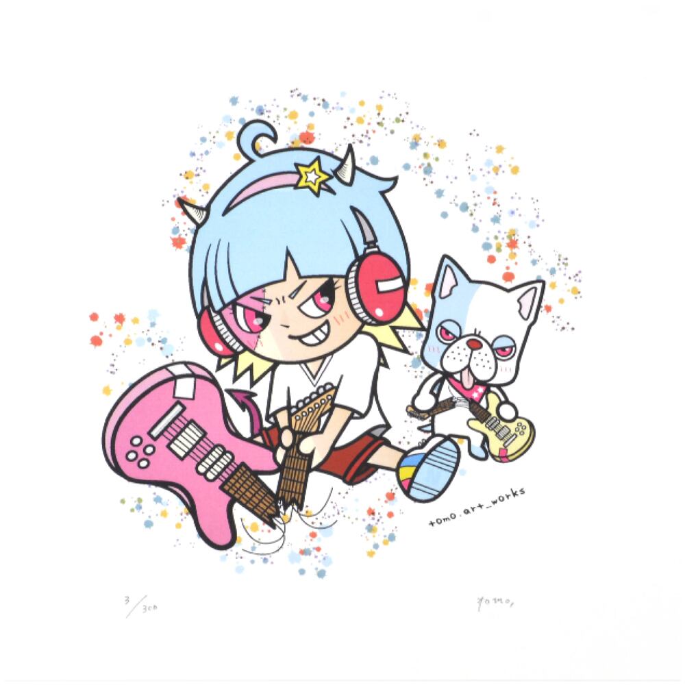 明るいブルーの髪と星のアクセサリーが印象的なキャラクターが、ピンクのギターを弾きながら元気いっぱいに微笑む作品です。隣には小さなギタリスト姿の犬が並び、ふたりのコンビが奏でるような楽しいリズムが伝わってきます。背景に舞うカラフルなドットが、音楽の高揚感やライブの熱気を感じさせ、見る人の気分を明るくしてくれます。ポップでエネルギッシュな魅力が溢れる一枚です。