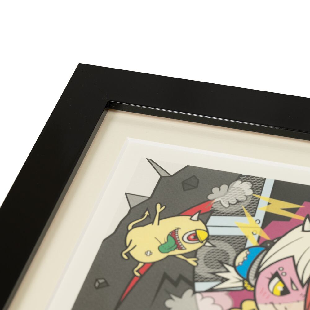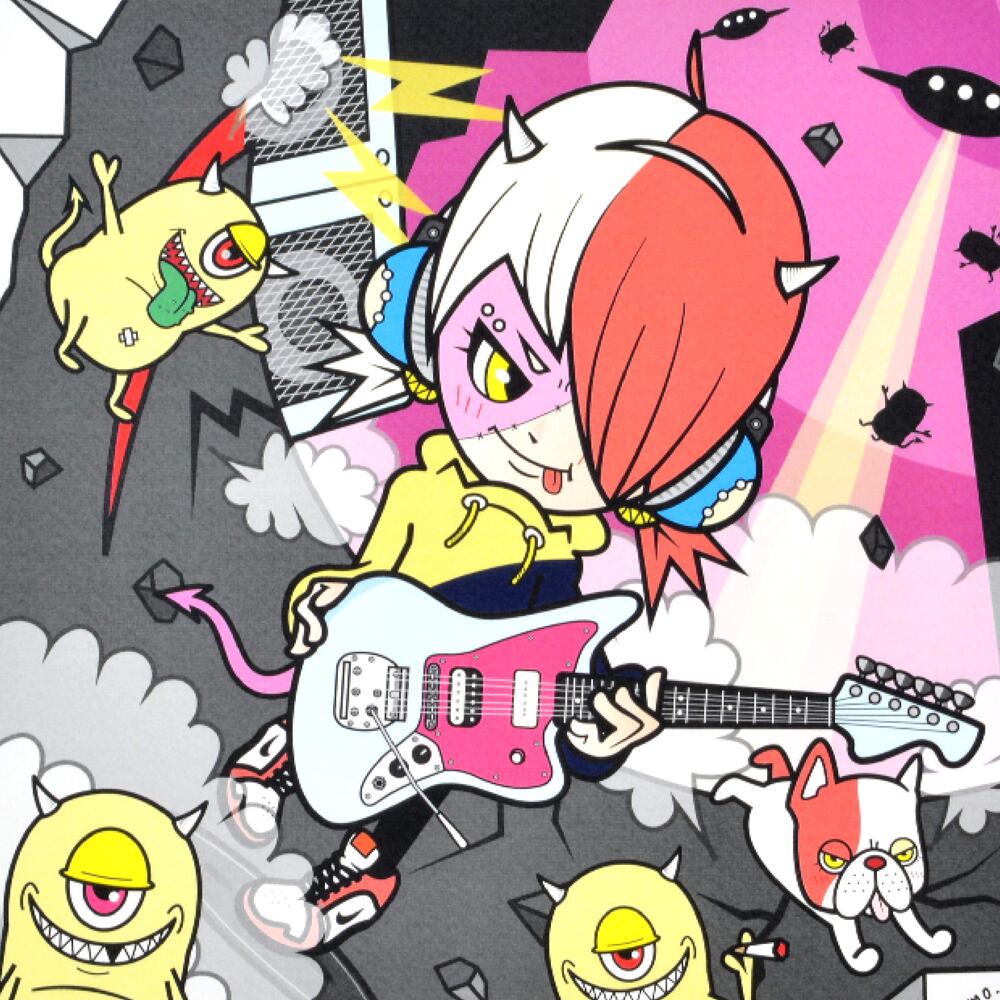 ギターをかき鳴らすキャラクターの周囲に、個性的なモンスターたちが飛び交うエネルギッシュな作品です。ビビッドなピンクやイエロー、ブルーが大胆に配置され、音と光が爆発するような臨場感を演出。キャラクターの挑発的な表情やポーズに、tomo.特有のユーモアとロックスピリットが詰め込まれています。まるでアニメのワンシーンを切り取ったような、元気と遊び心にあふれるアートです。