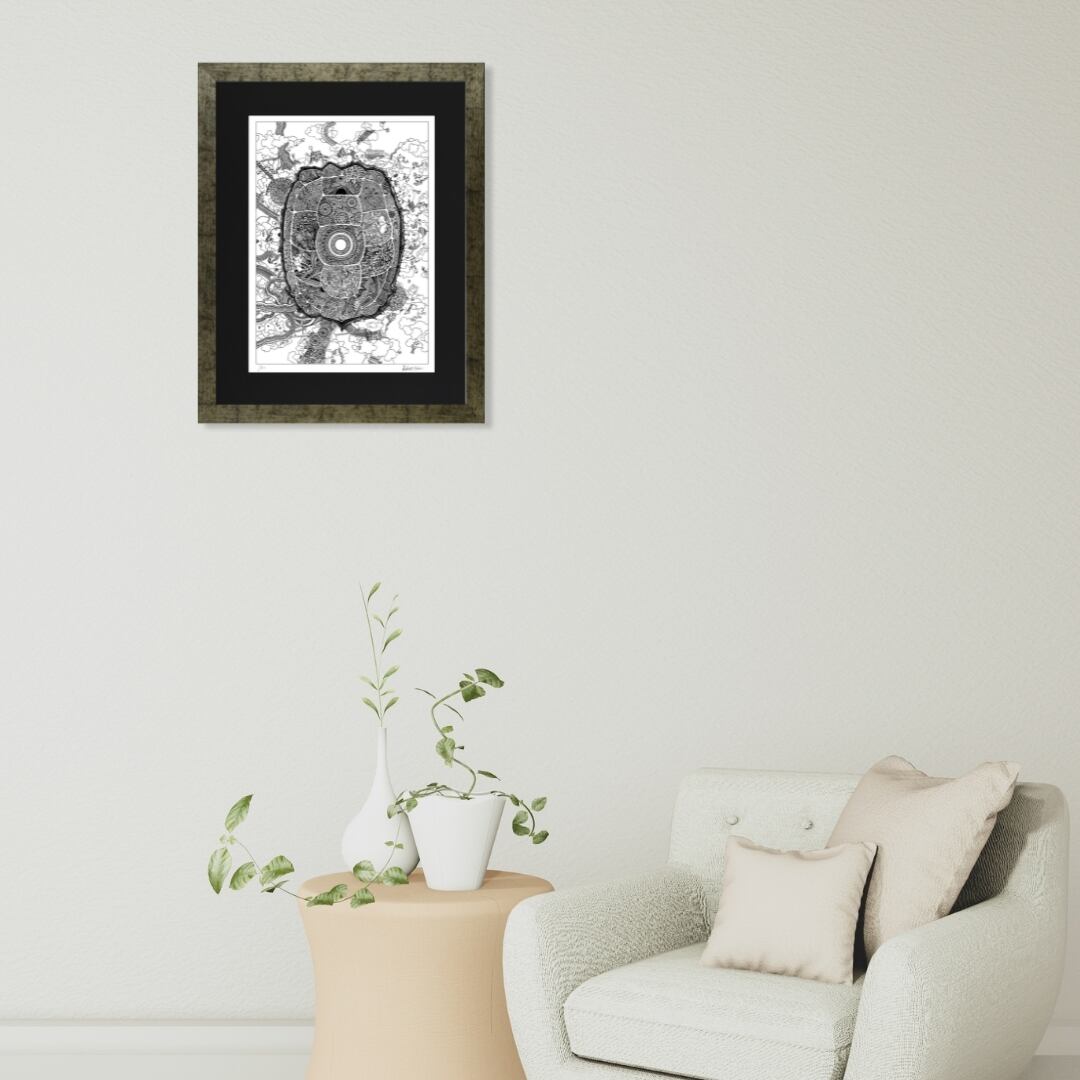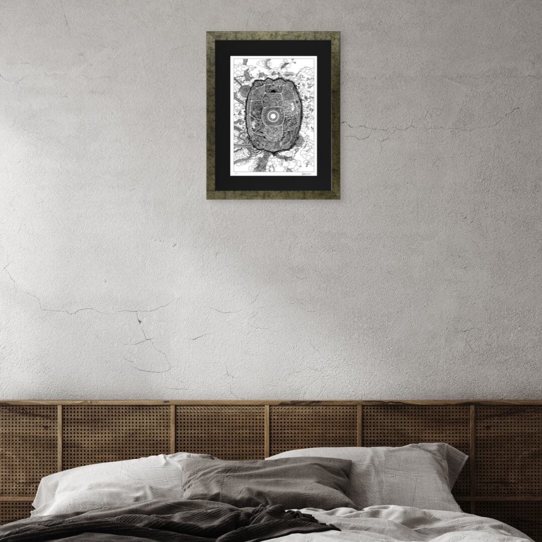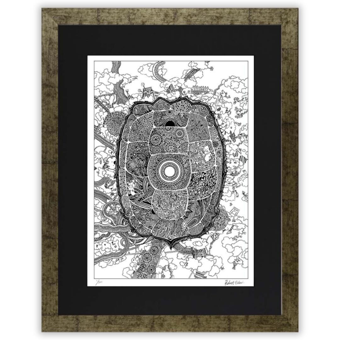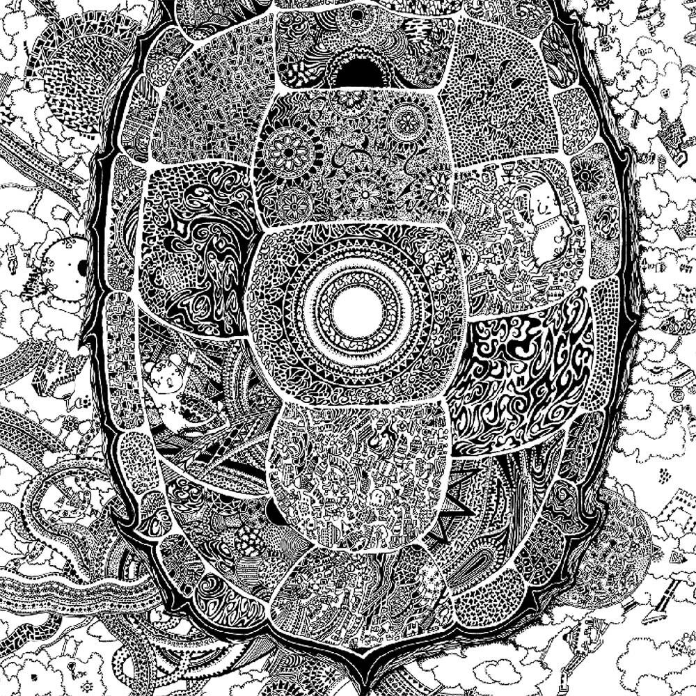 画面の中央に描かれた存在は、重厚な甲羅をまといながら悠然と佇み、生命の悠久を象徴するような迫力を放っています。甲羅の内部には、幾何学的な模様や自然を思わせる文様が細やかに刻み込まれ、まるで一つの宇宙を内包しているかのようです。背景には枝葉や雲のようなモチーフが広がり、外界と内界が交差する壮大な世界観を感じさせます。モノトーンで描かれた線の織りなすリズムは力強く、それでいて静謐な響きを持ち、見る者に深い余韻を残します。細部を追うごとに新しい発見が生まれ、観る人を長く惹きつける魅力を秘めています。