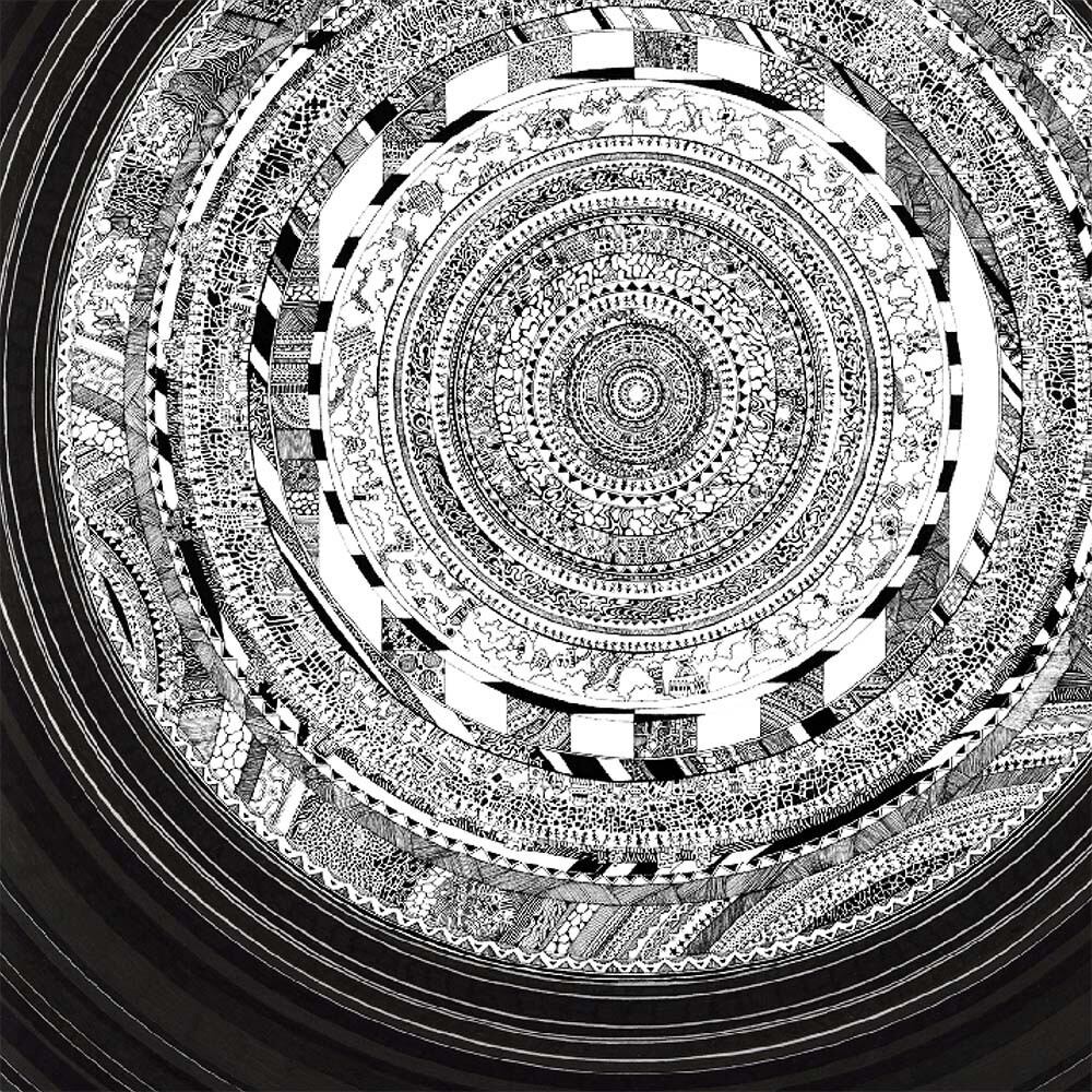 画面の中央から同心円状に広がる模様は、まるで宇宙の生成や時間の流れを象徴するかのように緻密に描かれています。繰り返されるパターンの中に潜む細やかな装飾は、観る者を引き込み、果てしない奥行きと広がりを感じさせます。外周へと伸びる線のリズムは波動のように広がり、静と動が共存するような不思議なエネルギーを放っています。モノトーンの世界における光と影の対比は、幾何学的な秩序と自然の有機性を同時に表現し、まるで一枚の中に無限の宇宙を閉じ込めたような深遠な印象を与える作品です。