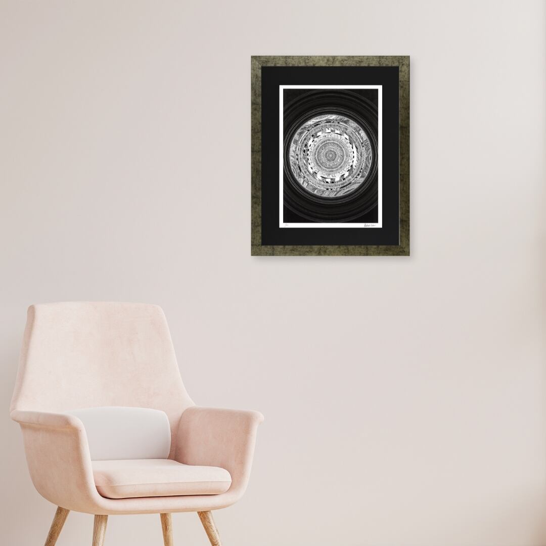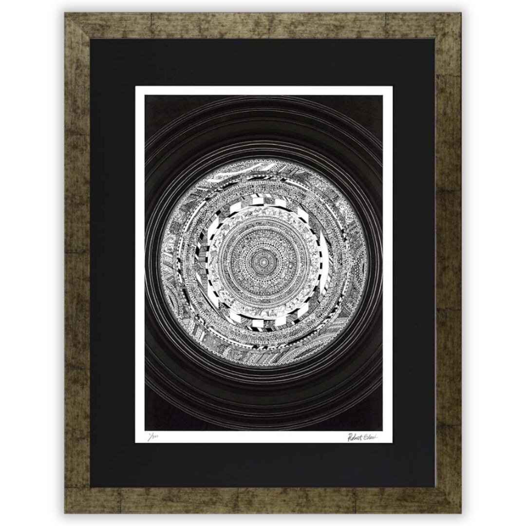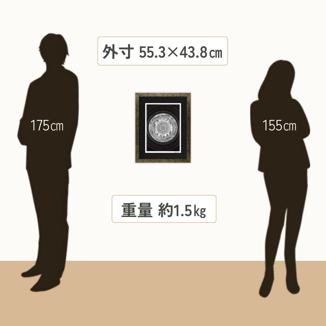緻密に描かれたモノトーンの世界が空間を引き締める、存在感のあるインテリアアートです。中央から広がる円環模様は静と動を併せ持ち、眺める角度や距離によって異なる印象を与えます。額入りアートとして仕上げられているため、そのまま壁に飾るだけで洗練された雰囲気を演出でき、モダンなインテリアやシンプルな空間との相性も抜群です。イラスト的な繊細さとアート作品としての力強さを兼ね備え、日常に特別なアクセントをもたらします。