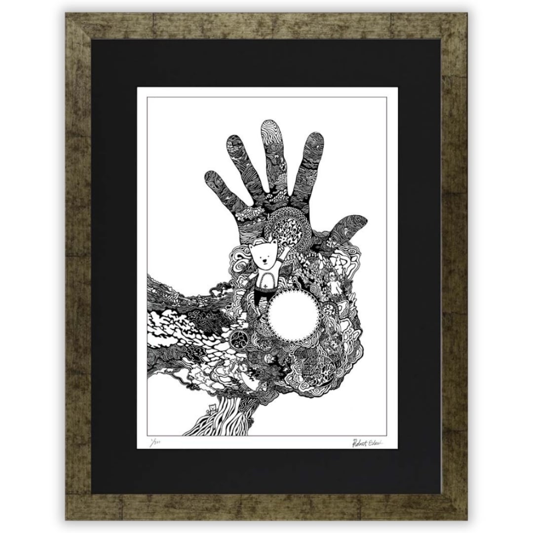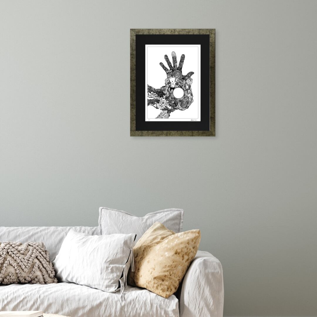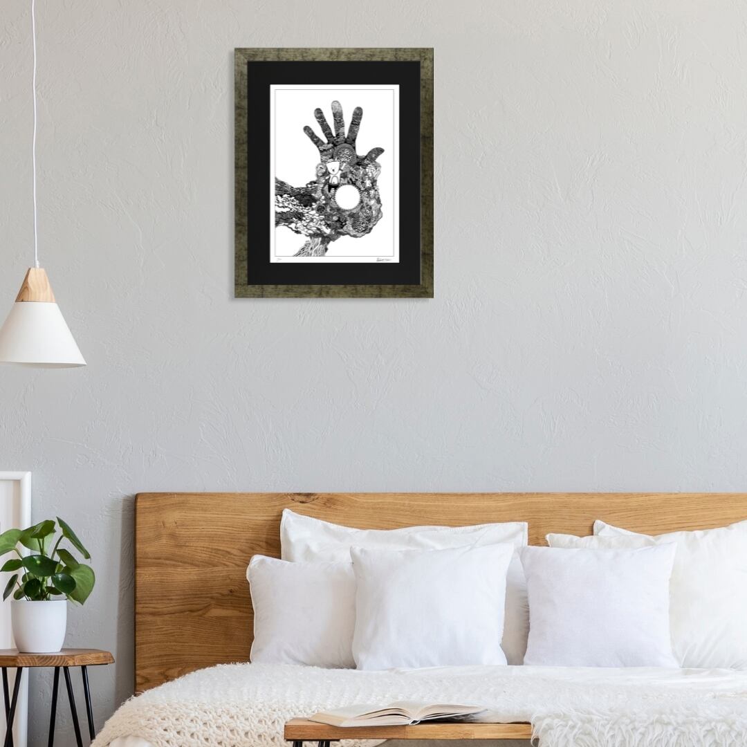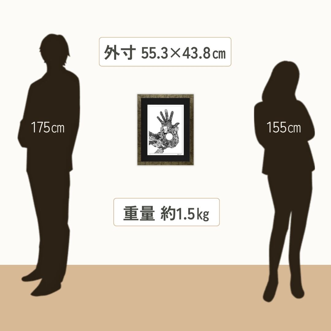 緻密な線描で構成された本作は、独特の存在感を放つインテリアアートです。大きく広がる手のフォルムと精緻な模様が融合し、空間に力強さと幻想的な雰囲気を添えます。額入りアートとして仕上げられているため、そのまま飾るだけで空間を洗練させ、モダンなインテリアやシンプルな部屋とも自然に調和します。イラストのような柔らかさと、アート作品としての緊張感を併せ持ち、日常の中に独特の物語性を添える一枚です。アートを生活に取り入れたい方に、特別なアクセントとしておすすめできる作品といえるでしょう。