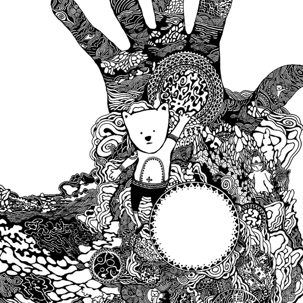 大きく掲げられた手のひらに広がる緻密な模様は、生命の循環や人と自然のつながりを想起させる幻想的な構成を持っています。幾何学的なパターンと有機的な線が共存し、空想の世界を描き出すような独自の世界観を形成しています。中央に佇む小さなキャラクターは、複雑な文様の中で穏やかに存在感を放ち、観る者に温かさと遊び心を伝えます。白と黒の強烈なコントラストは、静と動、秩序と混沌といった二面性を象徴するかのようで、作品全体に深みと緊張感を与えています。細部まで描き込まれたこの表現は、ただのイラストを超えた、物語性に満ちた芸術的な魅力を湛えています。