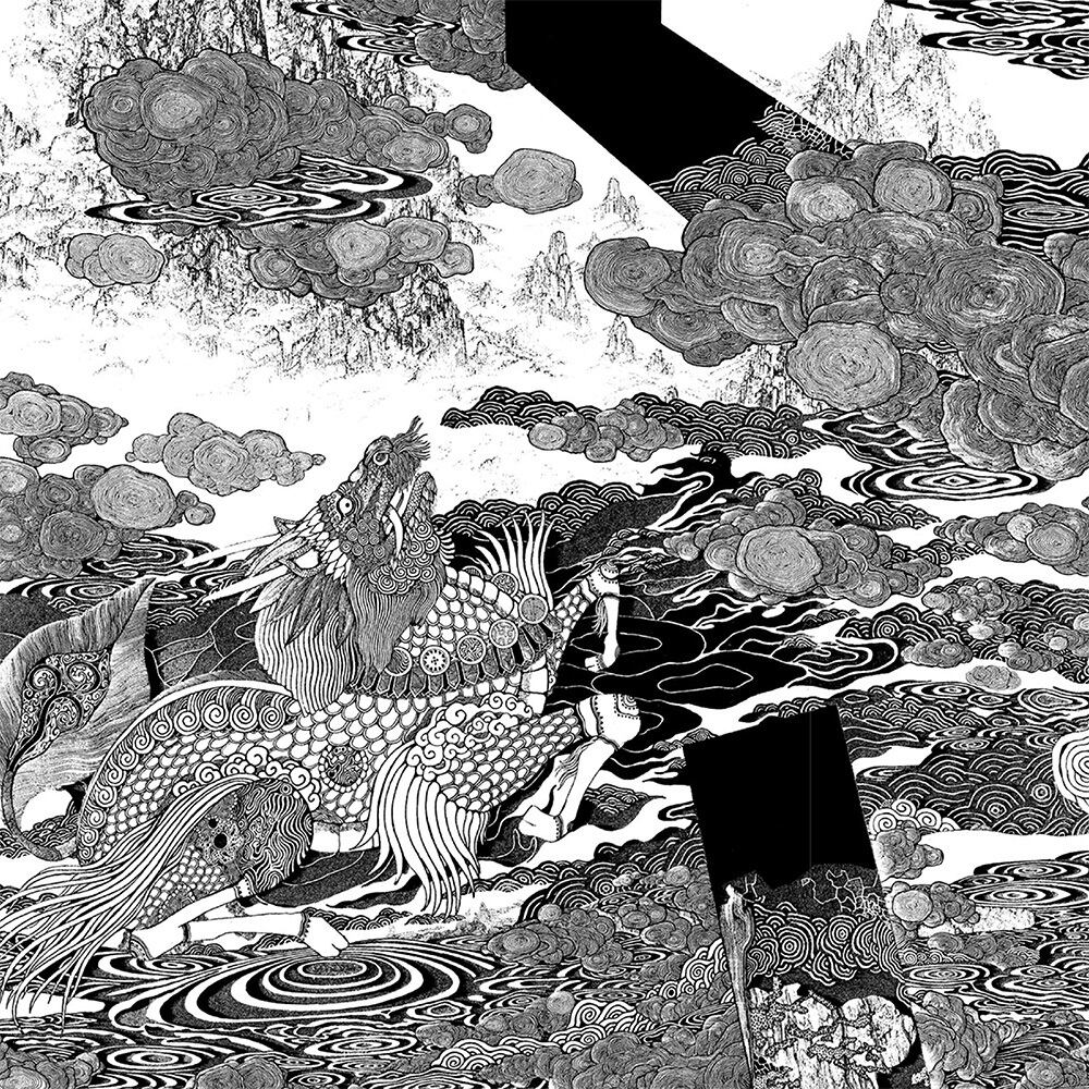 幻想的な風景の中に現れる神秘的な生き物は、静寂と力強さを同時に湛えた存在感を放っています。細密に描かれた雲や山々が奥行きをつくり出し、そこに浮かぶ幾何学的な要素が非現実的な世界観を強調しています。流れるような線のリズムと繊細な模様の重なりが、まるで異世界の物語を目の前に広げるかのようです。漆黒と白の対比が際立ち、伝統とモダンが融合したような印象を受けます。繊細でありながら大胆さを失わない表現力は、観る者を静かに引き込み、長く眺めるほどに新たな発見をもたらす魅力を持っています。