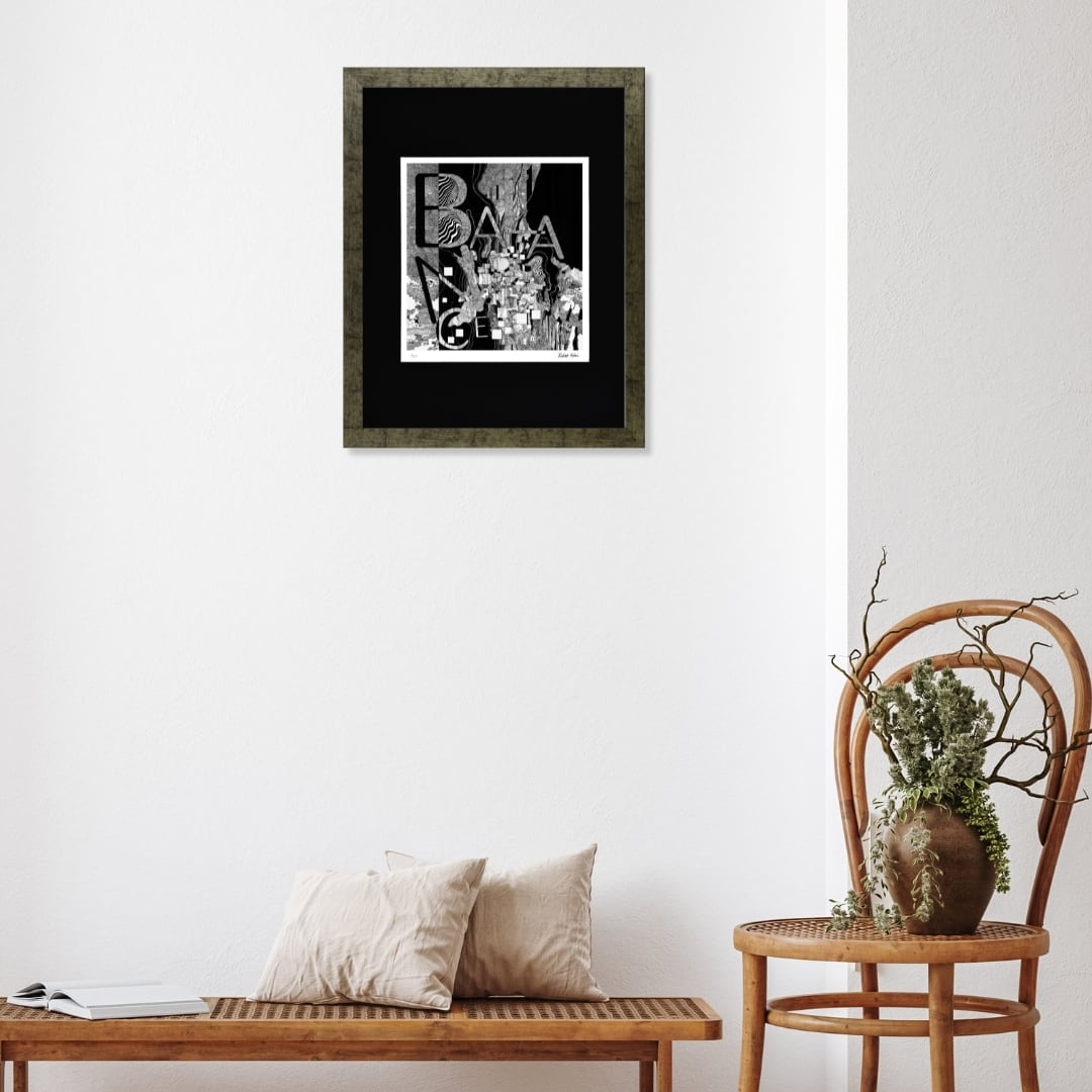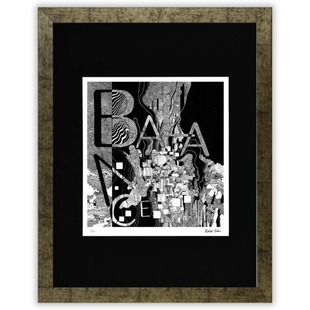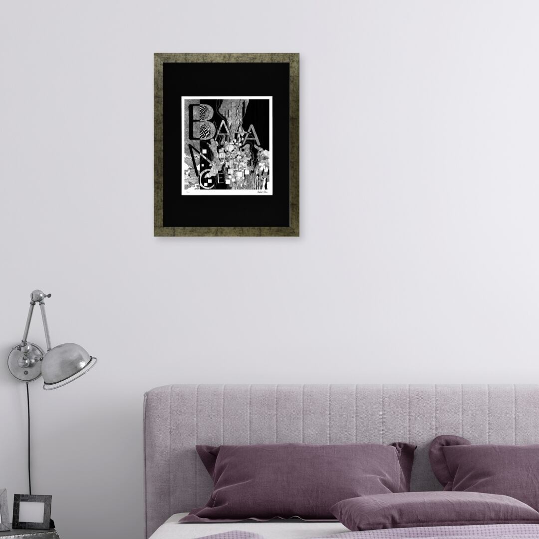 「BALANCE」という言葉を中心に構成されたモノクロの世界。幾何学的な形と有機的な線が複雑に絡み合い、静と動、秩序と混沌が共存する独特の構図を描き出しています。黒と白のコントラストが際立ち、まるで思考と感情の均衡を可視化したような印象。緻密な描線が織りなすリズムは、見る者の感覚を静かに刺激し、内なるバランスを問いかけてきます。抽象的でありながらもどこか人間的な温かみを感じるこのアートは、深い余韻を残す作品です。