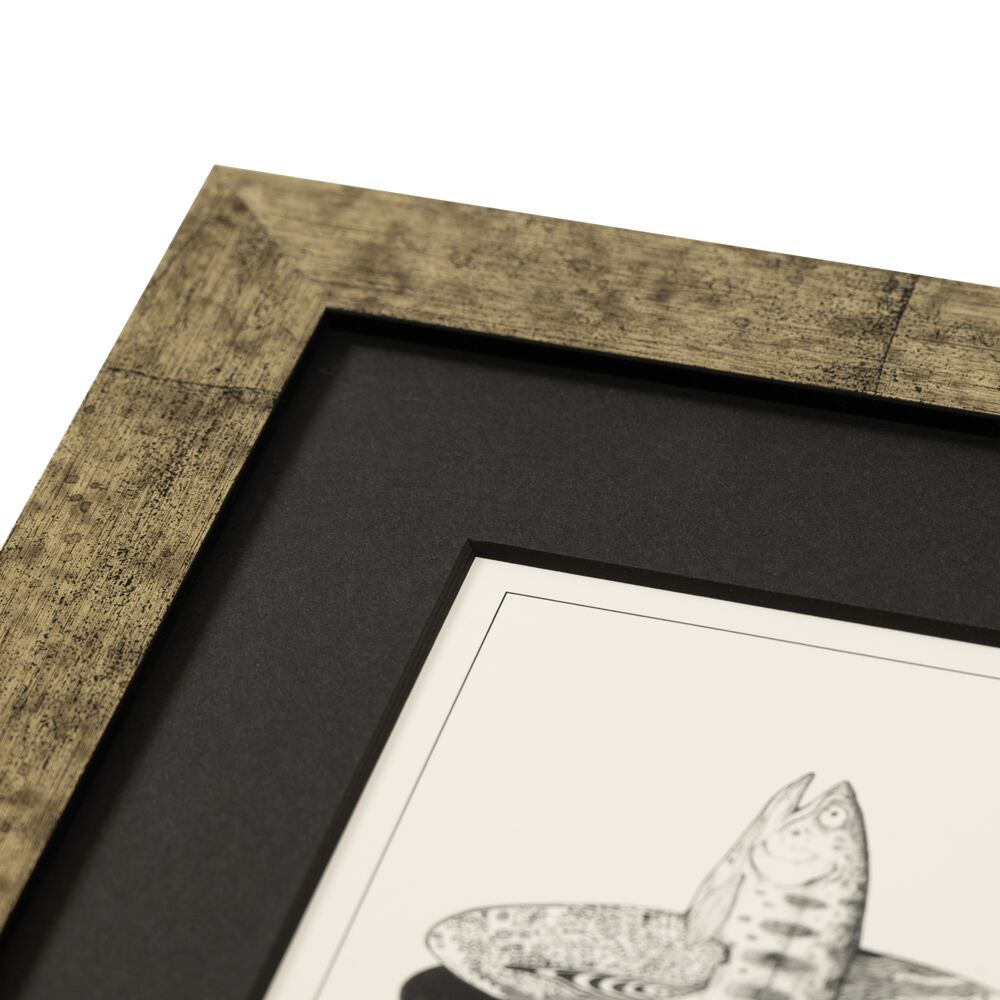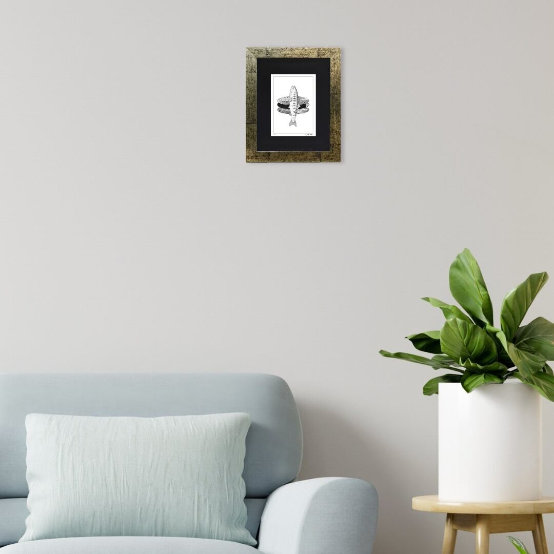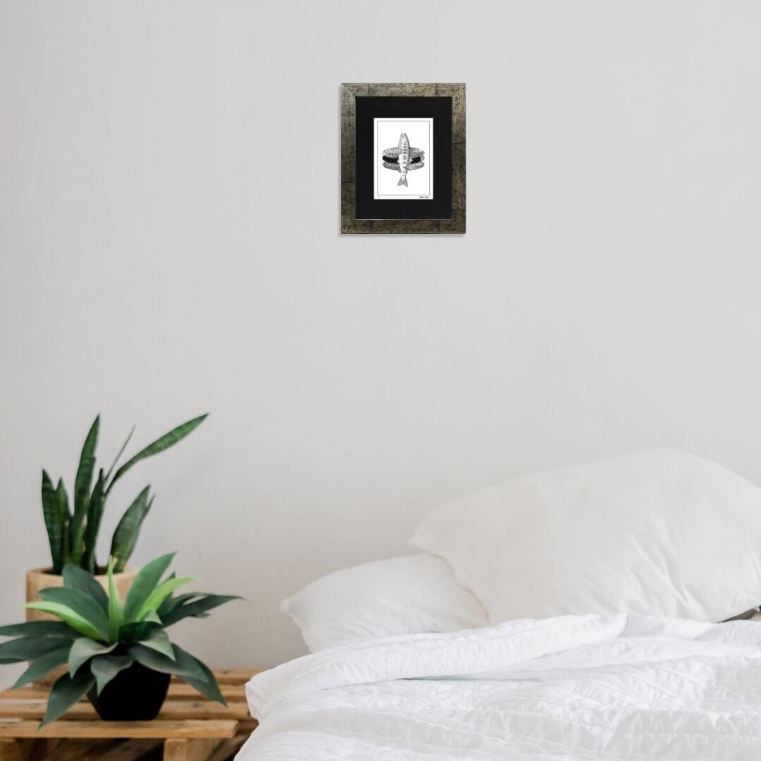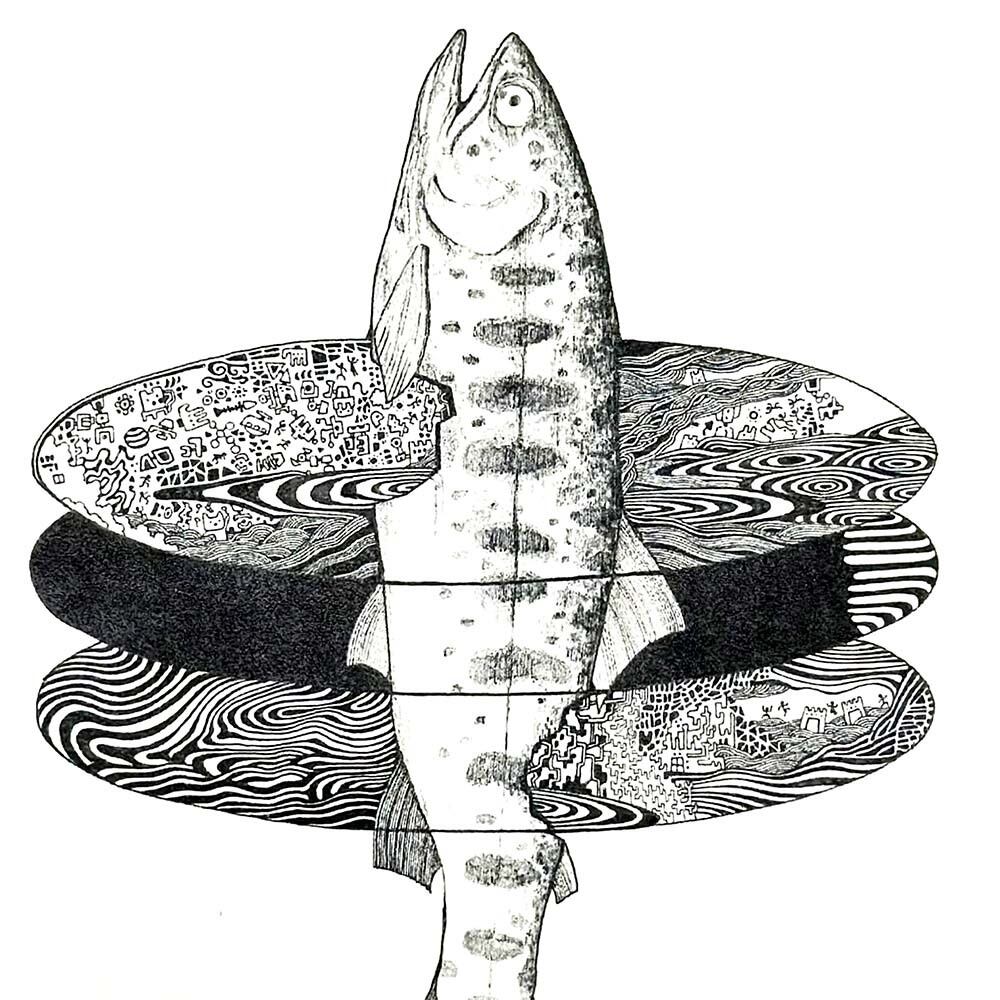 静かな水面から跳ね上がる魚の姿を、繊細な線と模様で描いた作品です。モノクロでありながら、水の流れや光の反射が感じられ、まるで命の鼓動が伝わってくるようです。魚の身体には、自然の模様や波紋のような装飾が施され、生命と自然の一体感を象徴しています。シンプルな構図の中にある奥行きとリズムが、静けさの中に力強さを感じさせ、見るたびに新しい発見をもたらす一枚です。