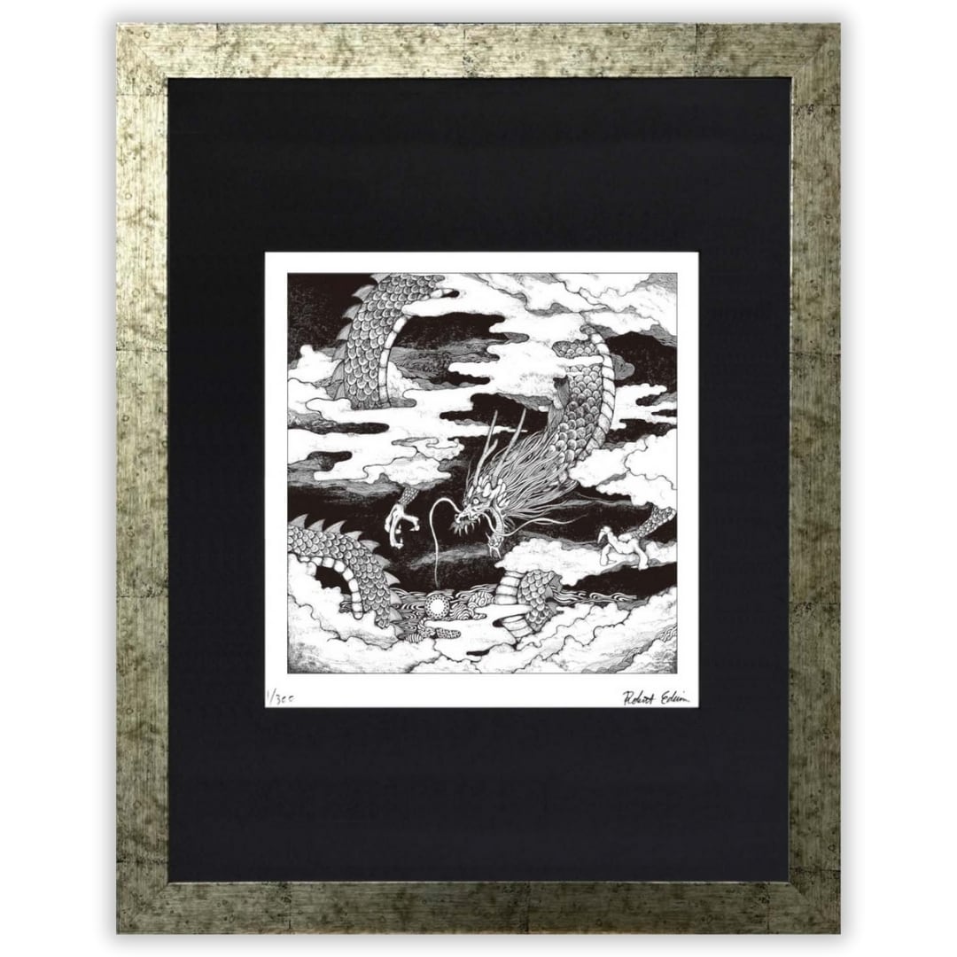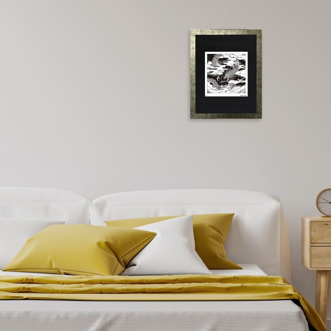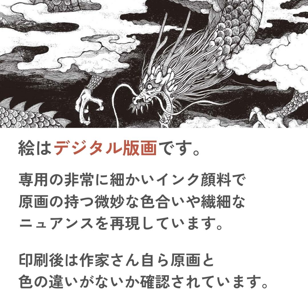 雲の合間をうねるように昇る龍の姿が、細やかな線描で力強く描かれています。龍の鱗や雲の動きまで丁寧に描かれた筆致は、まるで空気そのものが揺らめくよう。モノクロの中に潜む濃淡のリズムが、静と動を同時に感じさせ、見る人を幻想の世界へと誘います。伝統的なモチーフでありながら、現代的な構成と余白の美が調和し、永遠に続くようなエネルギーを感じさせる一枚です。