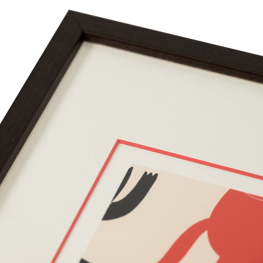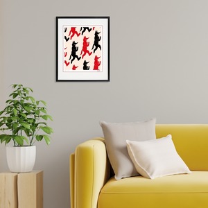 黒×赤の強いコントラストは視線を素早く捉え、空間にシャープな焦点を作ります。白壁はもちろん木目やコンクリートとも相性が良く、玄関・リビング・ワークスペースで気分を切り替えるアクセントに最適。反復するモチーフは遠目でも読み取りやすく、離れても印象が薄れません。額入りアートとして扱いやすく、モダンなインテリアアートのポイントづくりに役立つ一枚です。