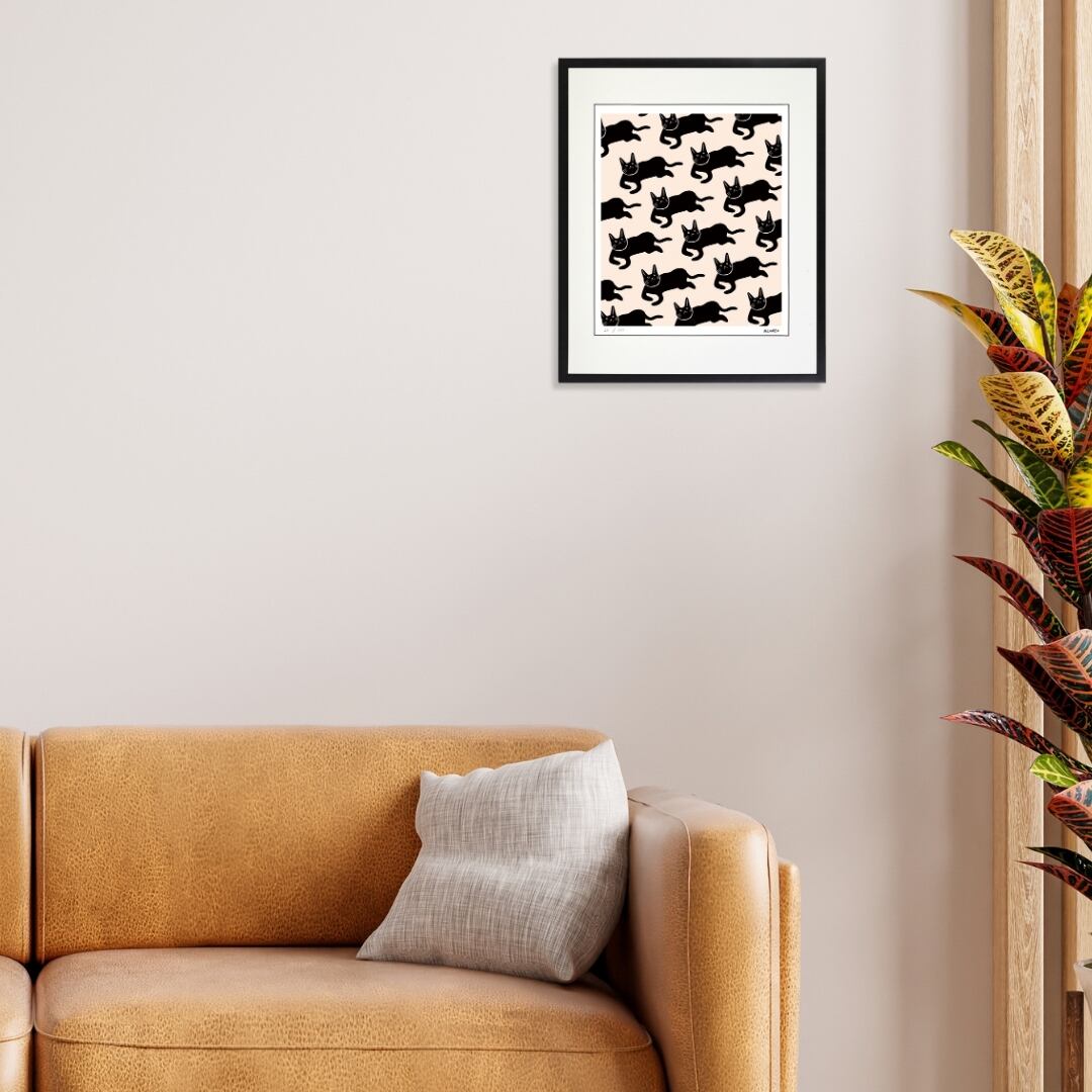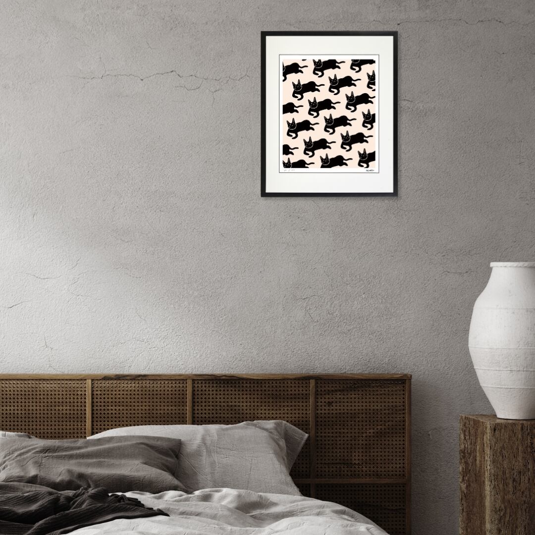 黒猫がユーモラスに並ぶデザインは、シンプルでありながら強い存在感を放ちます。背景の柔らかな色合いと、黒のコントラストが絶妙で、眺める角度や距離によって印象が変わるのも魅力です。動物をモチーフにしたイラスト表現は、遊び心と洗練を同時に感じさせ、空間に独自のリズムを生み出します。シンプルな構成ながらも大胆さを併せ持ち、モダンなアートとしての完成度も高く、インテリアに映える仕上がりです。可愛らしさとスタイリッシュさを両立し、日常にアートの楽しさを添えてくれる一枚となっています。