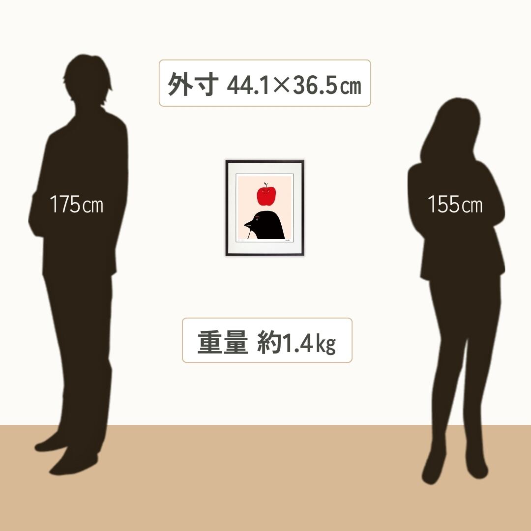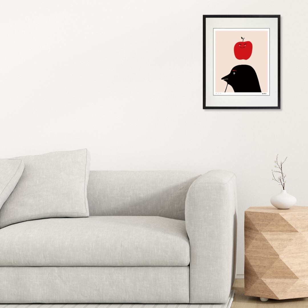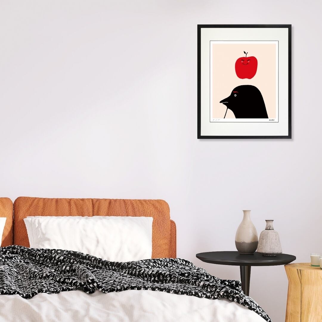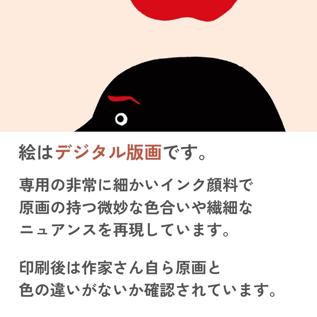 ユーモラスな構図と大胆な配色は、空間に明るさと軽快な雰囲気をプラスします。モダンでシンプルなデザインは、リビングやダイニングはもちろん、オフィスや書斎などにも違和感なく溶け込み、空間を引き締めつつ遊び心を添えます。額入りアートとして壁に飾ることで、シンプルな部屋にアクセントが生まれ、見るたびにクスッと笑えるような小さな楽しみを日常に与えてくれるでしょう。視覚的にも心理的にも、暮らしにリズムを刻む存在となります。