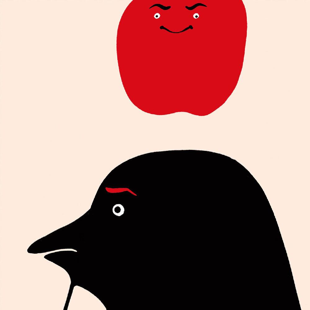 黒い鳥と、その頭上にちょこんと乗る赤いリンゴというユーモラスな構図が印象的な作品です。シンプルな色使いながらも、鳥の視線とリンゴの表情が絶妙に対話しているかのように見え、鑑賞者の想像を膨らませます。赤と黒のコントラストは視覚的なインパクトを与え、同時に遊び心を感じさせるデザインです。タイトルの「しばし考える」が示すように、鳥の何気ない一瞬が切り取られ、見る人に思索やユーモアをもたらす不思議な魅力を持っています。イラストとしての軽快さと、アートとしての奥行きを兼ね備えた作品です。