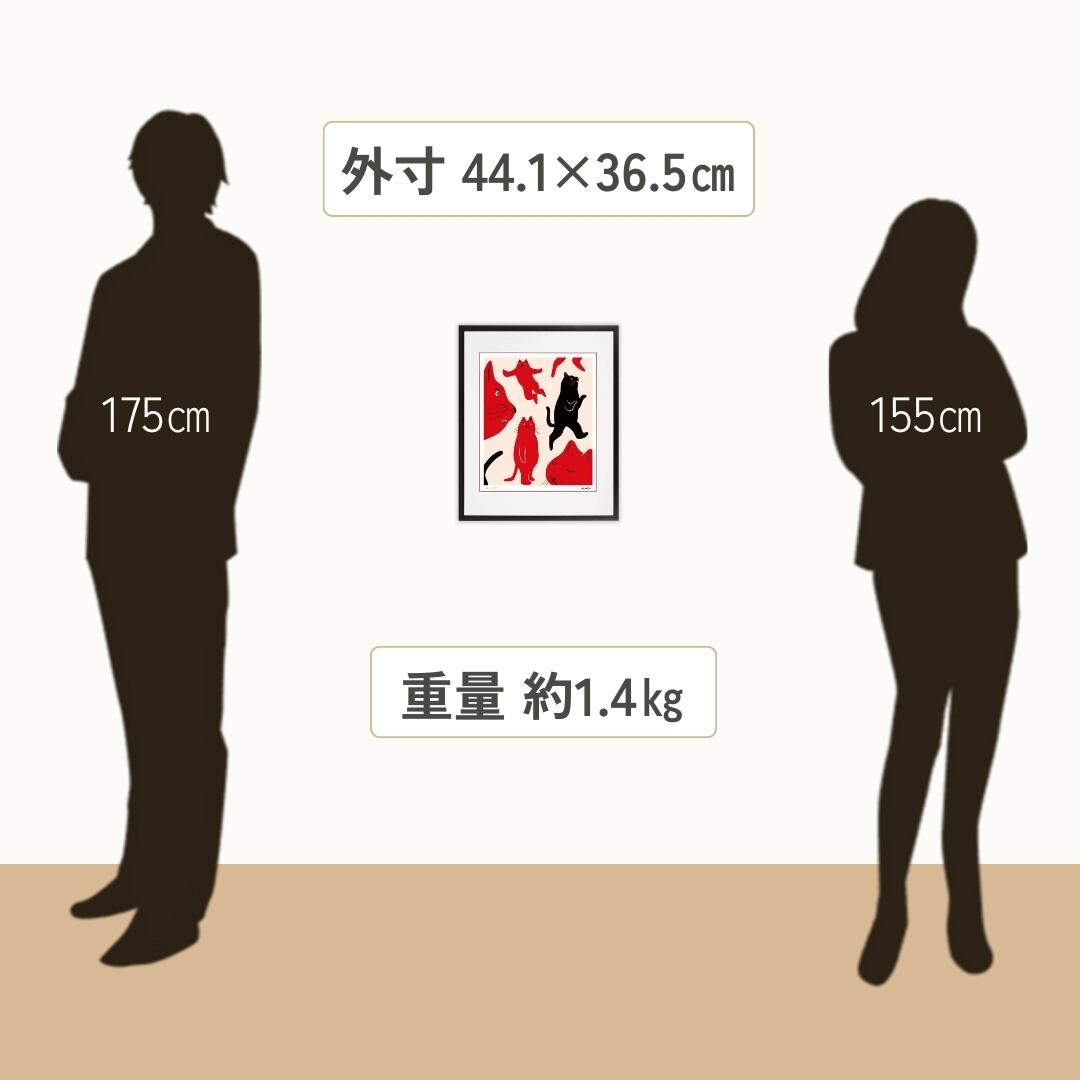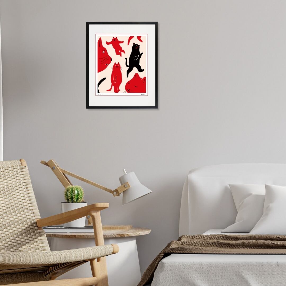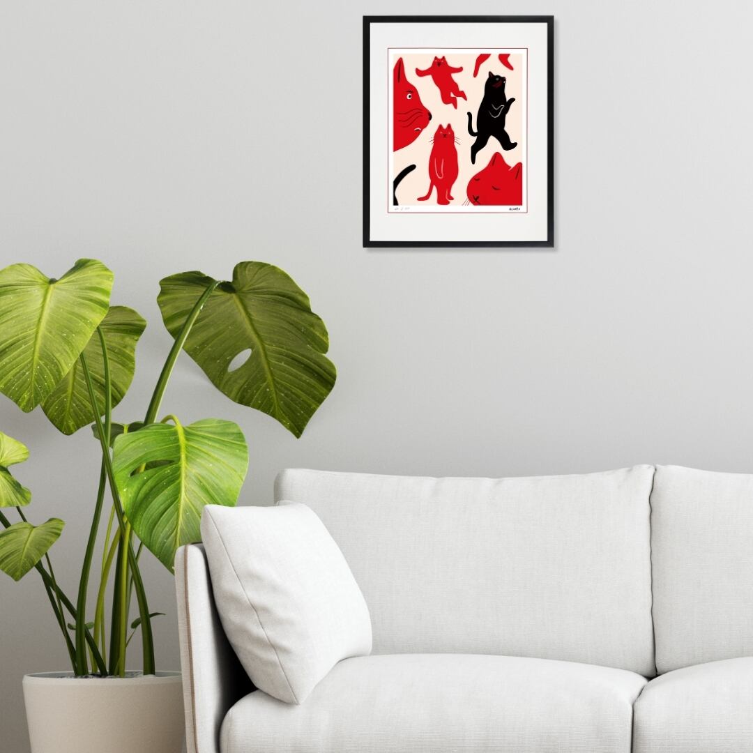 遊び心あふれる猫たちの姿は、飾る空間に温かみとユーモアを添えます。リビングや寝室など日常の場に置けば、ふとした瞬間に目に入るたびに心が和み、自由さを楽しむ気持ちを思い出させてくれます。シンプルでモダンな色使いはインテリアとの相性も良く、ポップなアクセントとしてお部屋を引き立てます。額入りアートとして壁に掛けることで、空間に軽快なリズムと柔らかな印象を与え、暮らしにユーモアとリラックスをプラスしてくれるでしょう。