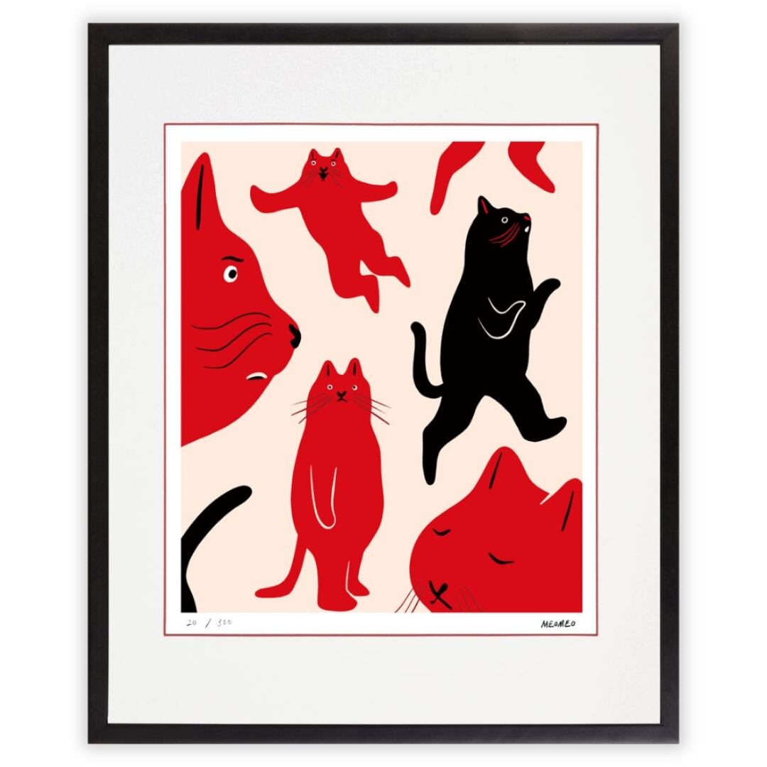 赤と黒で描かれた猫たちが、自由気ままに様々な表情やポーズを見せる作品です。歩いたり、見上げたり、寝転んだりと、まるで猫という存在そのものの気まぐれさや愛らしさを映し出しているように感じられます。シンプルな色彩と大胆な構図によって、モチーフのユーモラスさが一層際立ち、鑑賞者に楽しげな気分を運びます。作品タイトルの「猫は自由に生きている」にも通じるように、猫の魅力である奔放さや飄々とした姿が、イラストとしてユーモラスかつ力強く表現された一枚です。
