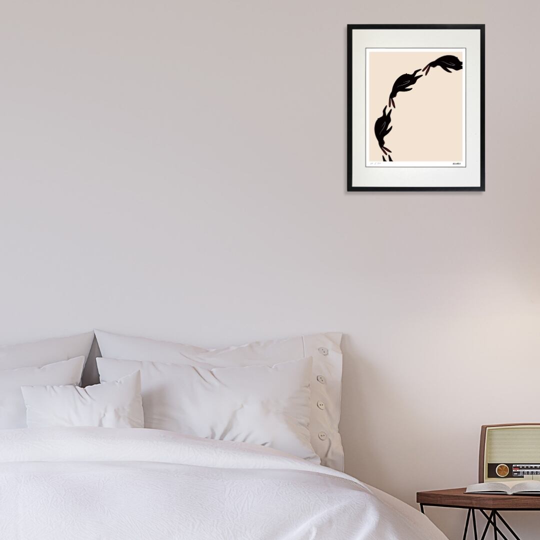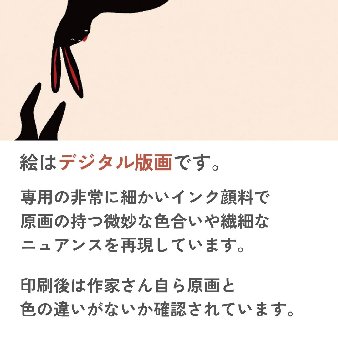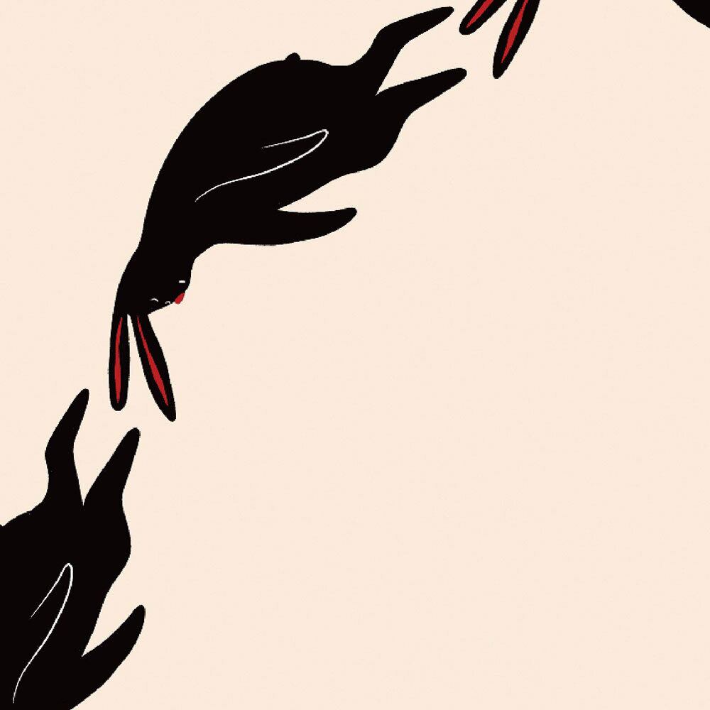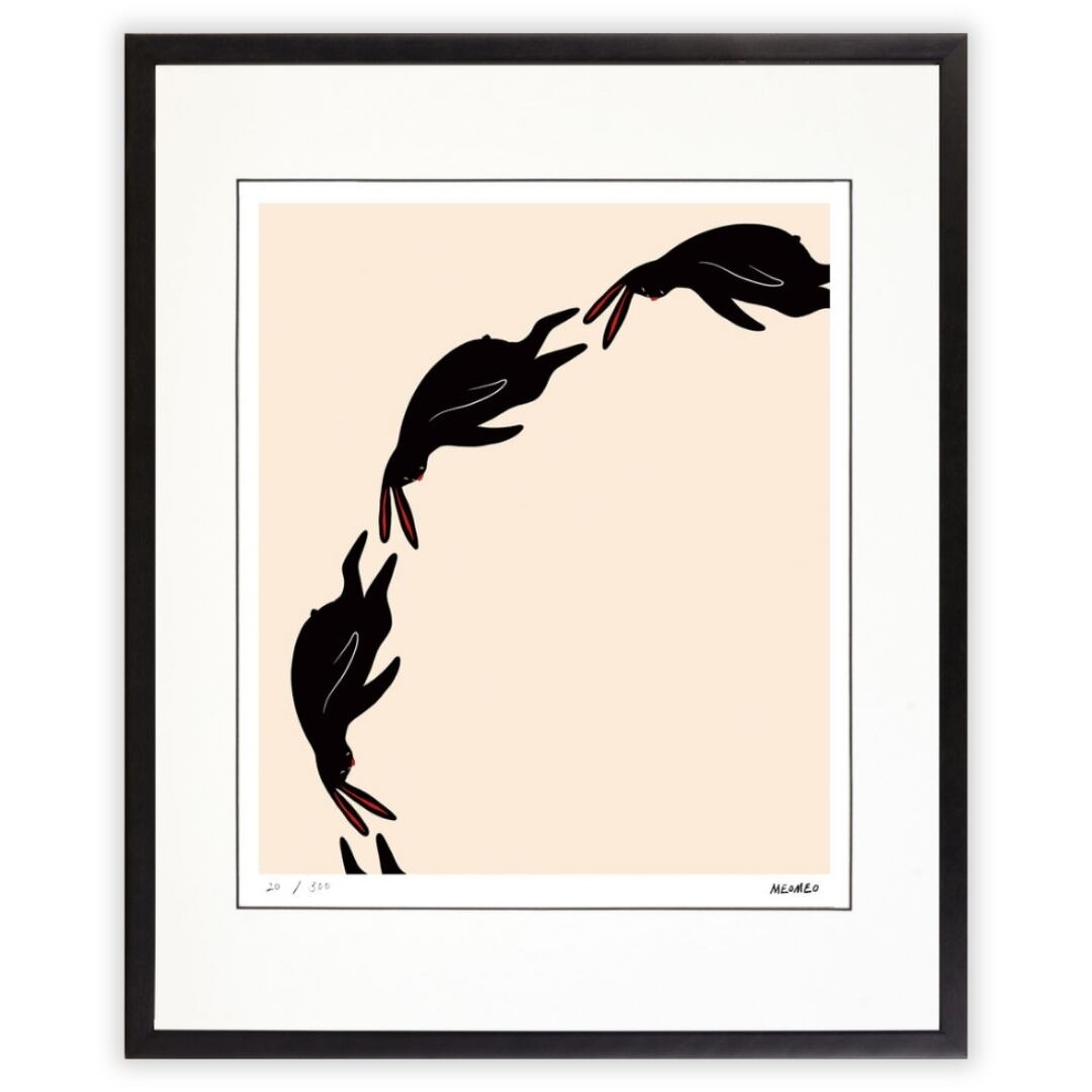 黒いウサギが宙を舞うように連続して描かれ、円弧を描きながら落ちていく姿がリズミカルに表現されています。背景は余白を活かしたシンプルなベージュで構成されており、黒いシルエットの中に赤い目と耳の差し色が鮮やかに映えます。繰り返し配置されたウサギたちは、まるで永遠に続くような運動の軌跡を示し、見る人に時間や重力を意識させる構図となっています。ユーモラスでありながらもどこか哲学的な要素を含み、軽やかさと深い余韻を同時に感じさせる魅力的な作品です。