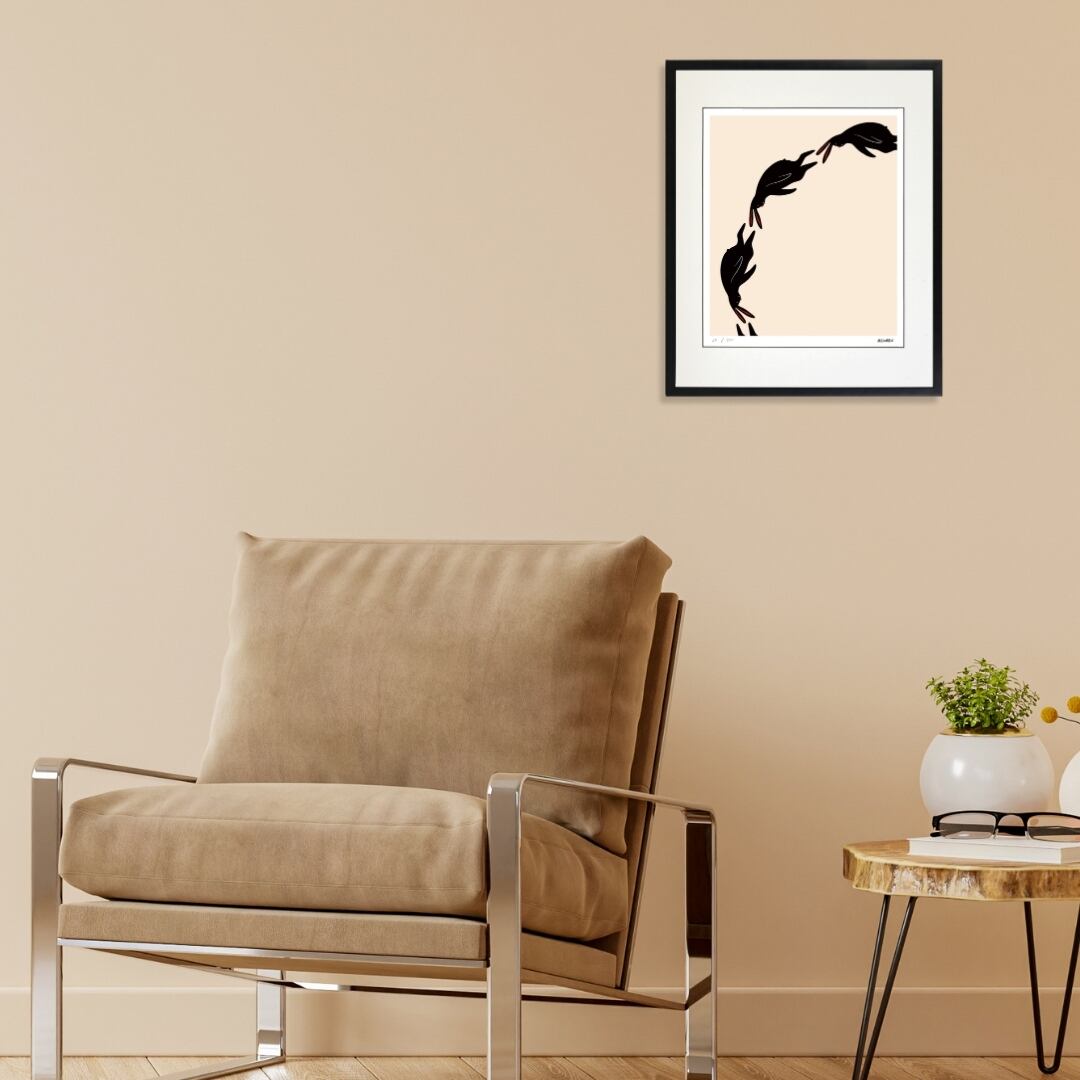 この作品はシンプルながら強いインパクトを持ち、飾る空間にモダンな躍動感を与えてくれます。流れるような円弧の構図は視線を自然に誘導し、壁面を広々と感じさせる効果があります。特にモノトーンやナチュラル系のインテリアに合わせれば、赤の差し色がアクセントとなり、空間全体に洗練された印象をプラスします。リビングや廊下など日常の視線が通る場所に飾ることで、動きと遊び心を取り入れ、日々の生活に新鮮な刺激とユーモアを添えてくれるでしょう。