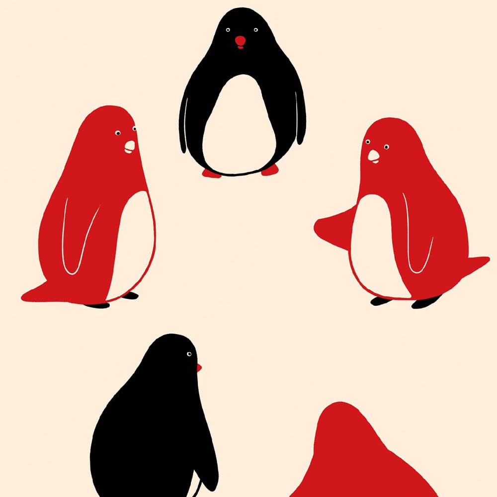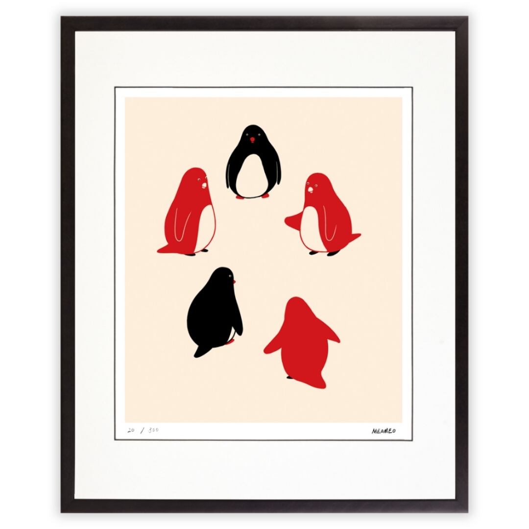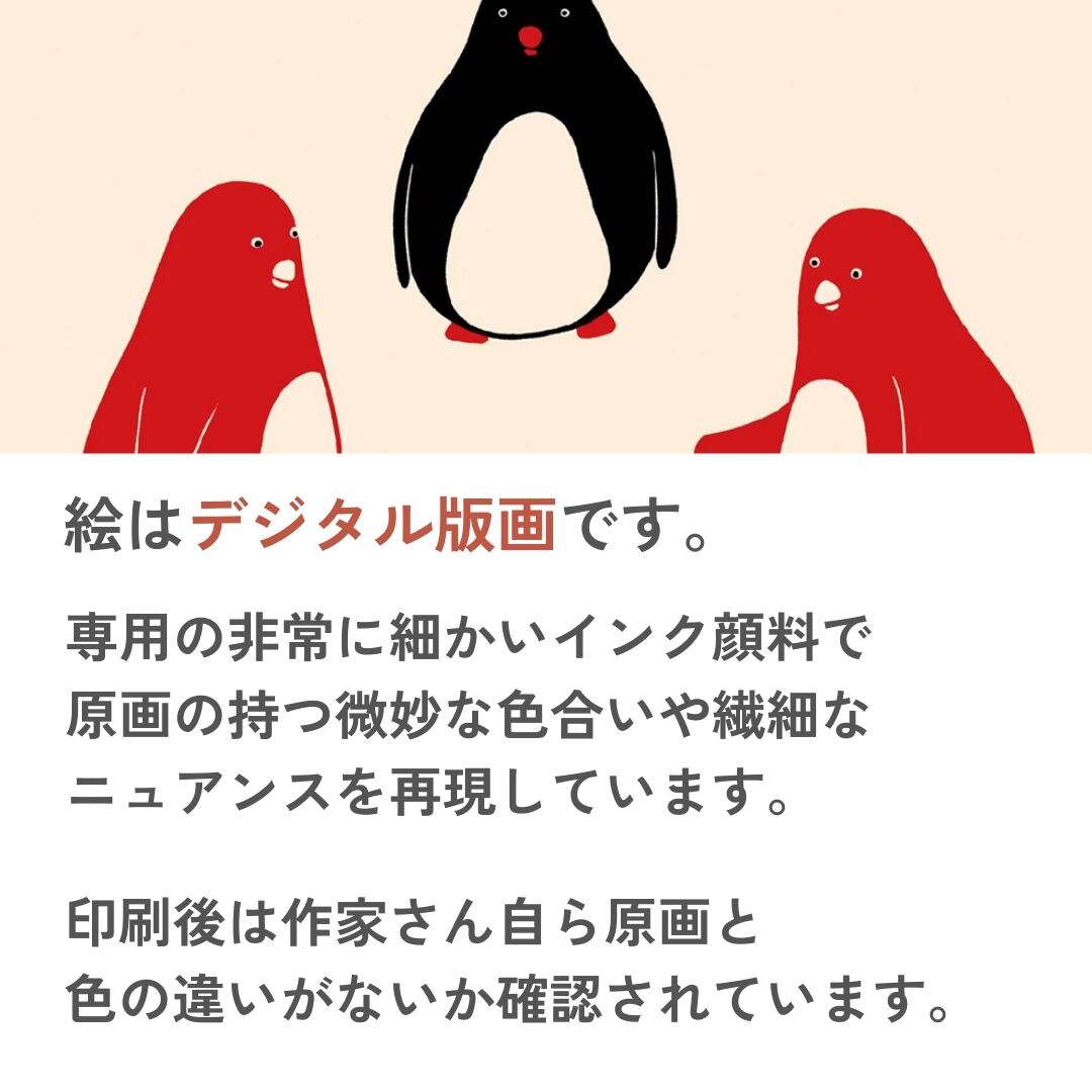 円を描くように並ぶ5羽のペンギンたちが描かれた作品です。赤と黒のシンプルな配色が、愛らしさの中に力強さを加えています。互いに向き合う姿はまるで久しぶりに顔を合わせた仲間同士が語り合っているようで、ほのぼのとした温かさを感じさせます。背景の余白がペンギンたちの存在を一層際立たせ、親しみやすくユーモラスな雰囲気を演出しています。シンプルでありながらもストーリーを想像させる、見る人の心に微笑みをもたらす一枚です。