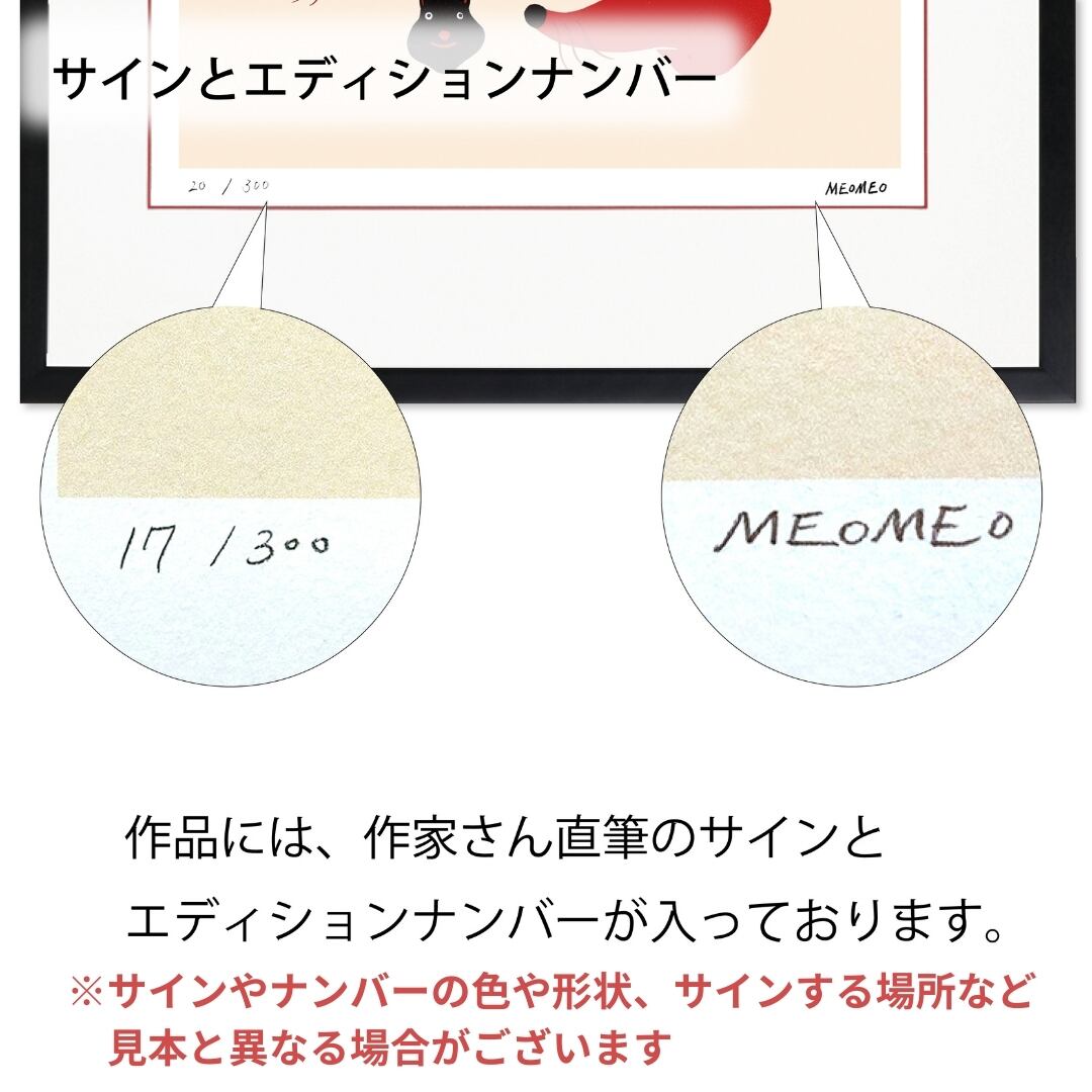 イラストレーター「MEOMEO(メオメオ)」のイラストを版画作品に。どこか不思議で可愛らしい動物たちの世界をお楽しみください。