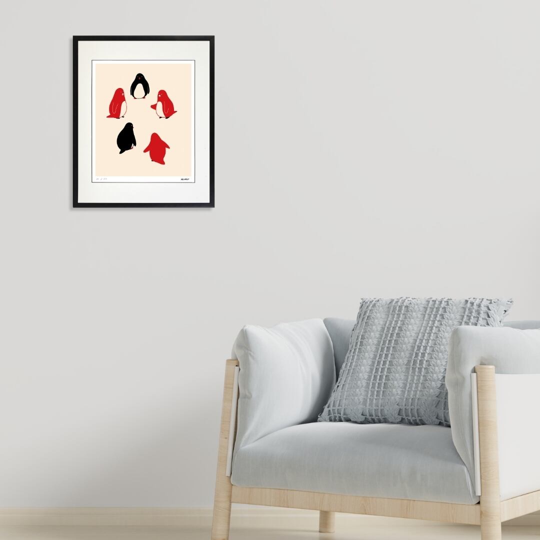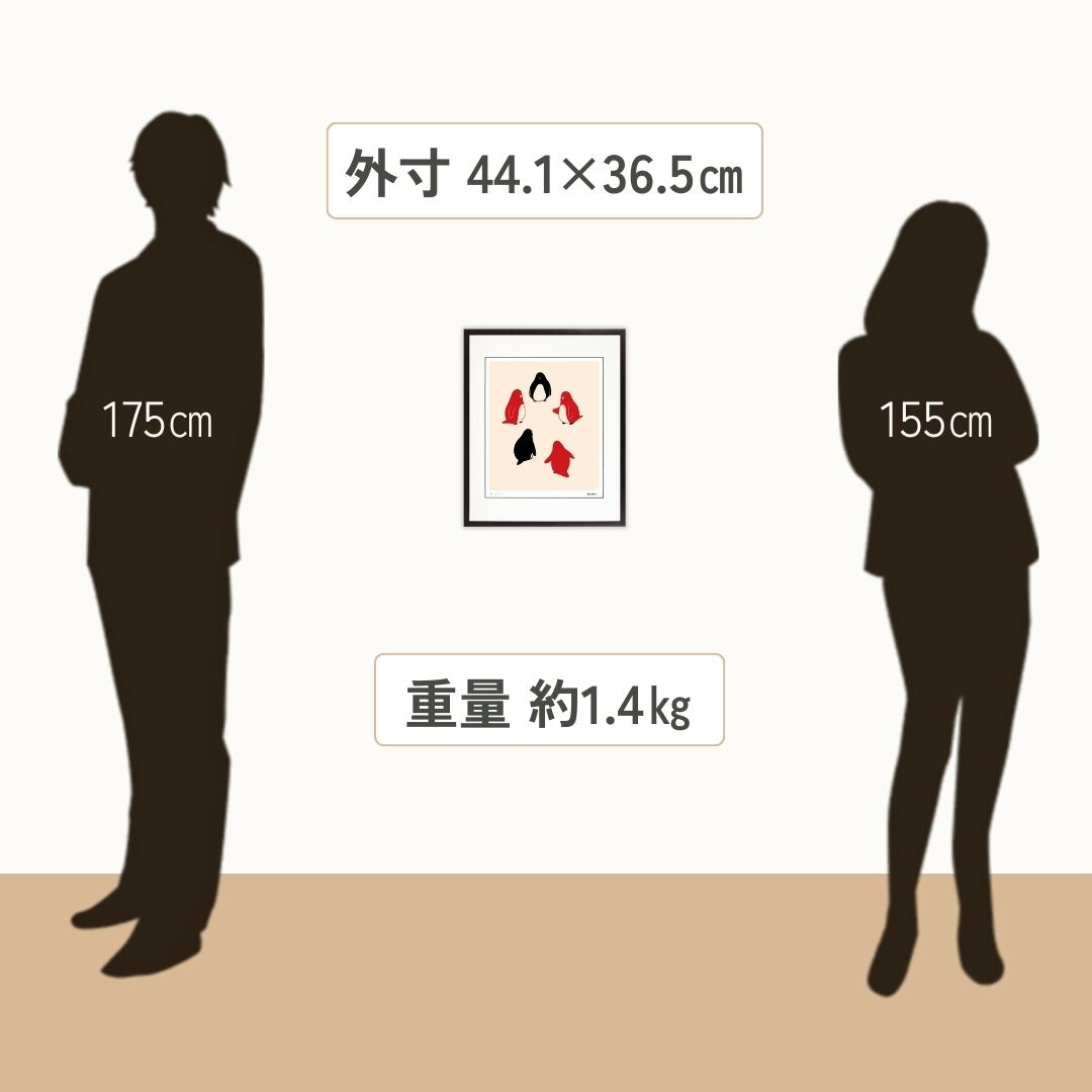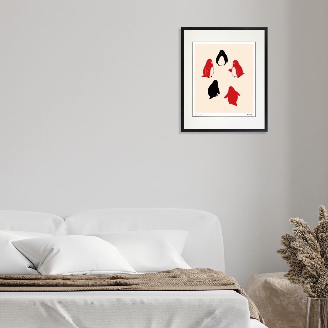この作品を飾ると、空間にユーモアと柔らかい活気が加わります。ペンギンたちの集まりは、家族や友人とのつながりを思い起こさせ、リビングやダイニングにあたたかな雰囲気を広げます。また、子ども部屋に飾れば遊び心を感じさせるイラストとして親しみを演出できます。シンプルなデザインなので北欧風やモダンなインテリアにも調和しやすく、壁にアクセントを加えたいときに最適です。気軽に楽しめる額入りアートとして、毎日の暮らしを楽しく彩ってくれます。