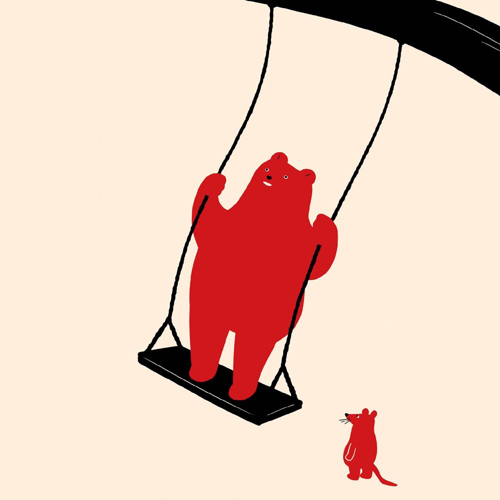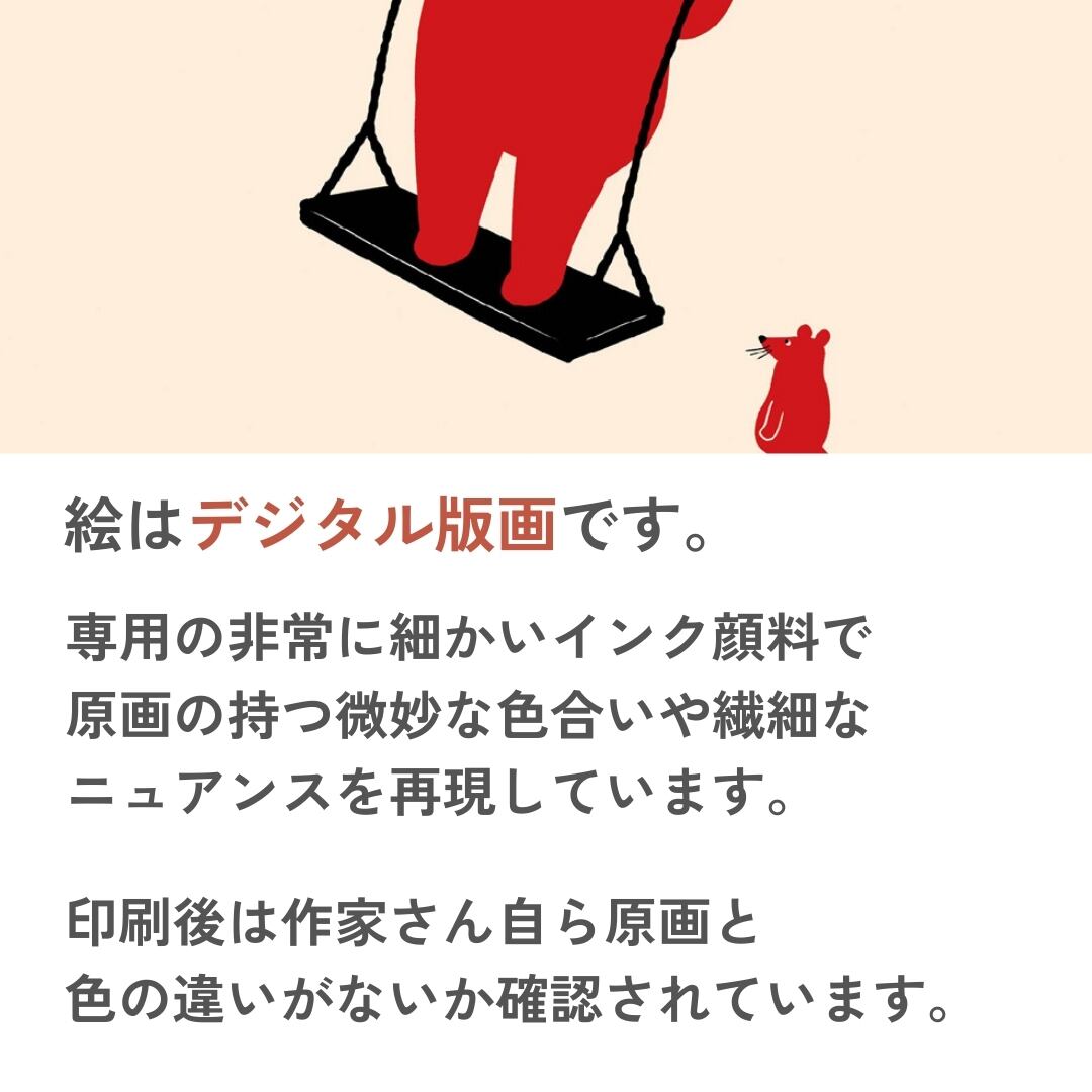 太い枝に吊るされたブランコに乗るクマの姿がユーモラスに描かれています。その足元では小さなネズミが見上げており、二匹の対比が温かく微笑ましい雰囲気を生み出しています。背景は余白を活かしたシンプルな構図で、登場するキャラクターの存在感を際立たせています。童心を思い起こさせるブランコのモチーフと、動物たちの素朴な表情がどこか懐かしさを感じさせ、見る人に穏やかな癒しと笑みを届けてくれる作品です。