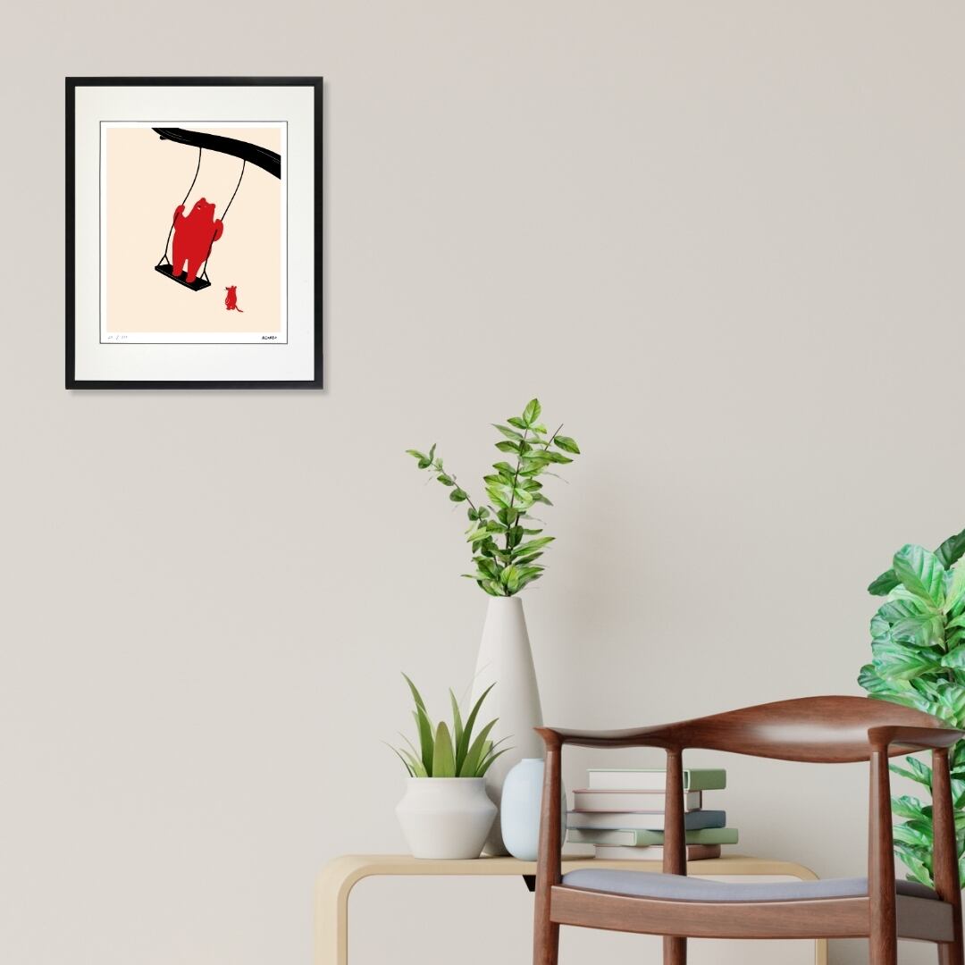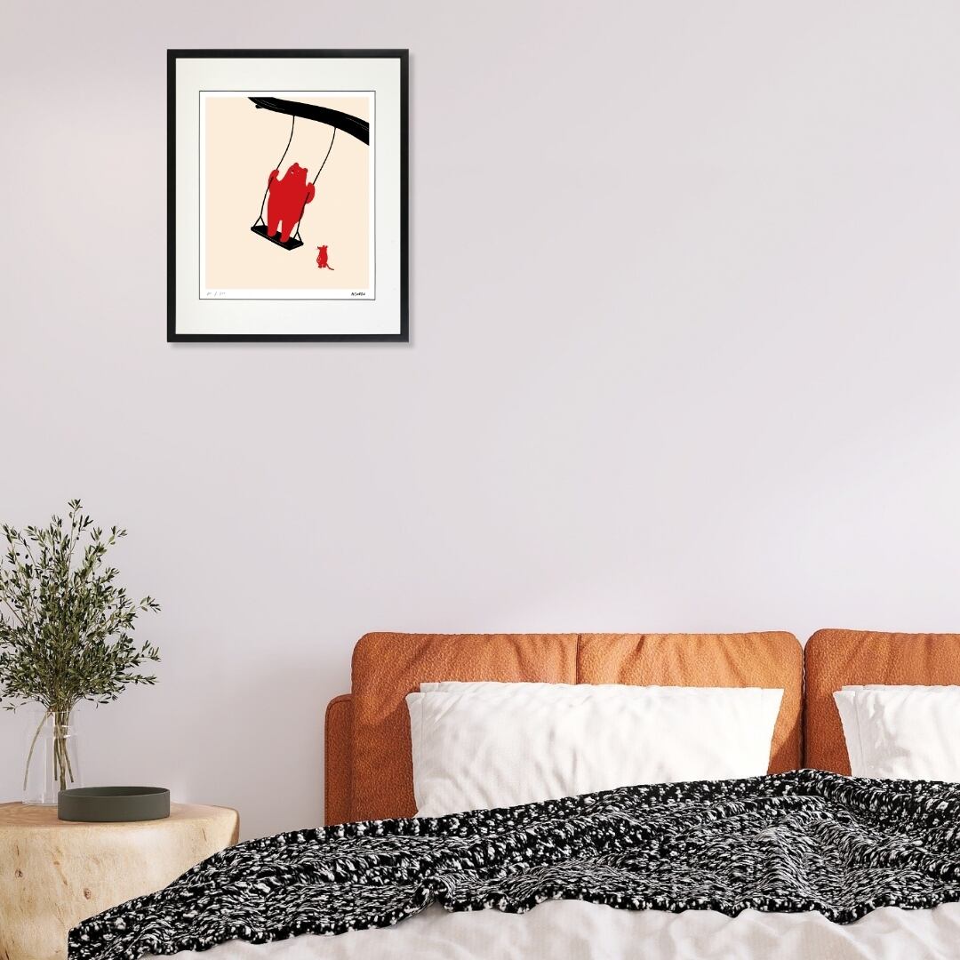 このアートは、部屋に遊び心とやさしい雰囲気を添えるインテリアアートとして最適です。クマとネズミの対話のような構図は、眺める人に物語を想像させ、日常に小さな楽しみをもたらします。子ども部屋やリビングに飾れば、明るさとユーモアを感じる空間に変わり、来客の目を引くポイントにもなります。シンプルでありながら洗練されたイラストなので、モダンな壁面装飾としても取り入れやすく、暮らしをやさしく彩る額入りアートとして長く楽しむことができます