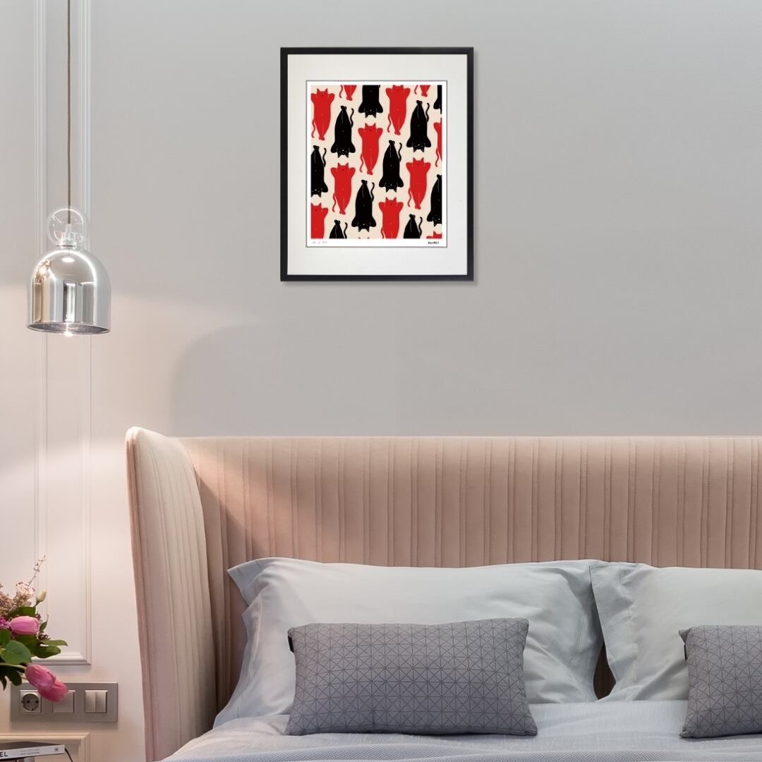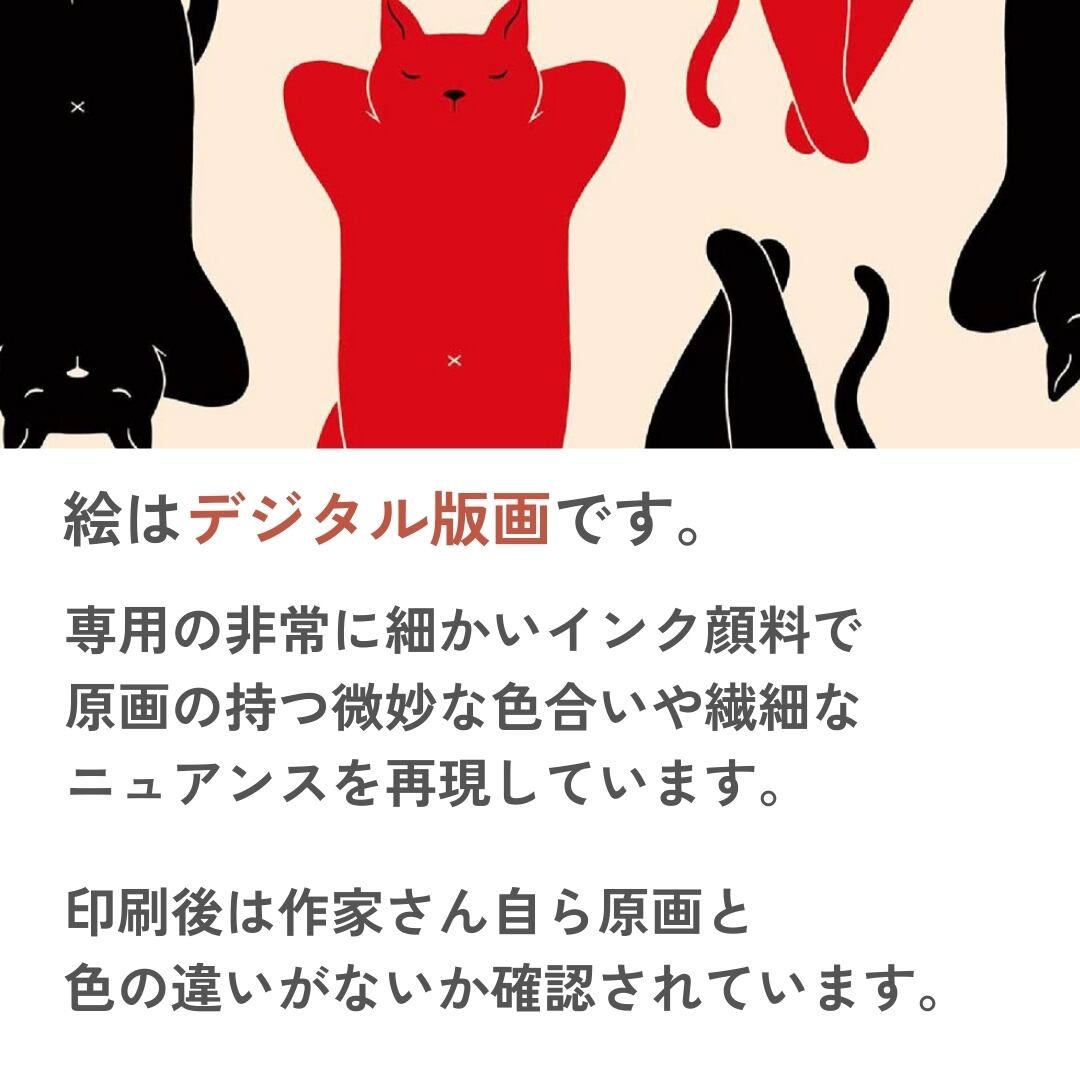 赤と黒の猫たちが規則的に並んだこのアートは、ユーモラスでありながら洗練された雰囲気を空間に与えます。リズム感あるデザインは、モダンなインテリアとも相性が良く、飾るだけで壁面がスタイリッシュな印象に変わります。寝姿の猫という親しみやすいモチーフが、リビングや寝室に落ち着きを添え、癒しの空気を運んでくれるでしょう。イラストならではの遊び心と、アート作品としての存在感が同居する一点であり、額入りアートとして気軽に飾れるのも魅力です。暮らしに楽しさと温かみをプラスするインテリアアートとしておすすめです。